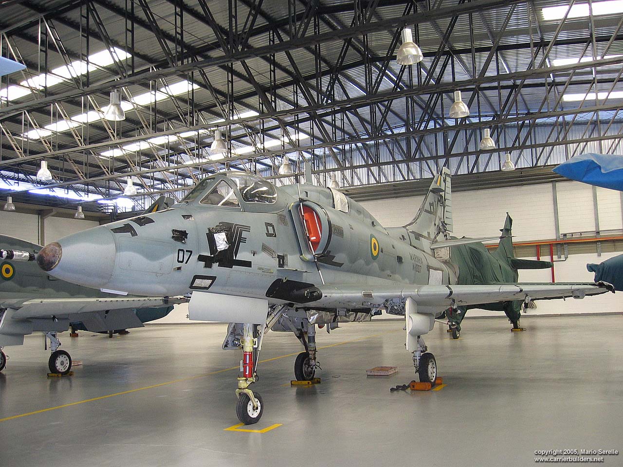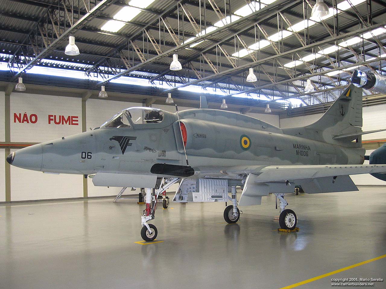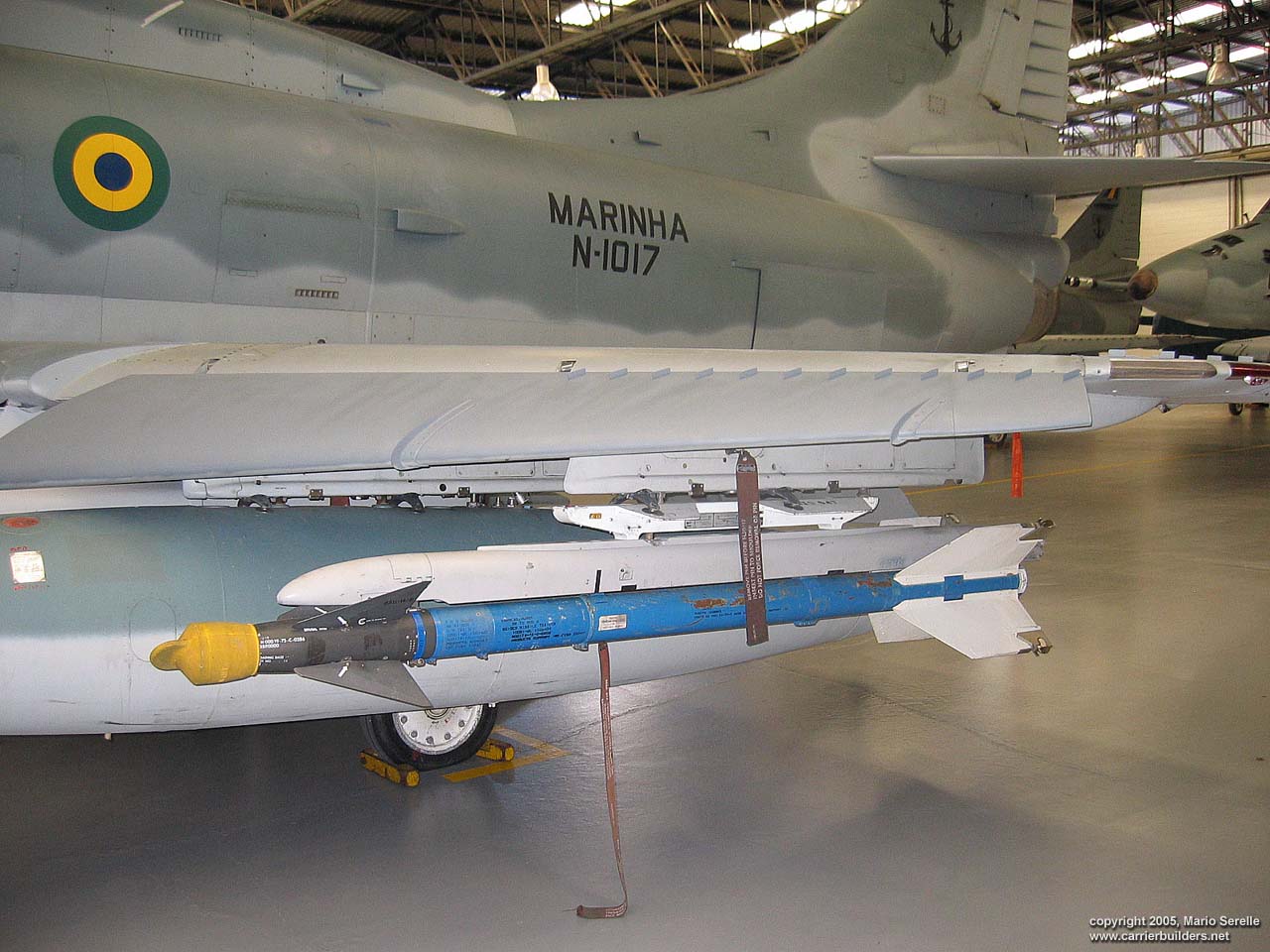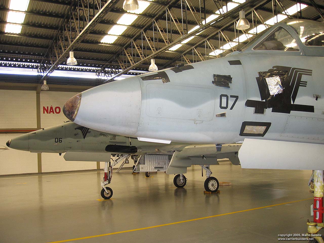 With United States cooperation, in 1997 Brazil negotiated a $70 million contract for purchase of twenty A-4KU and three TA-4KUs from Kuwait. These are operating from A-12 "São Paulo", former French Navy R99 "Foch". It was purchased from France in 1999. The Kuwaiti Skyhawks were re-designated AF-1 and AF-1A. 1280 pixel wide images! Photos © 2005 by Mario Serelle June 27, 2005 |