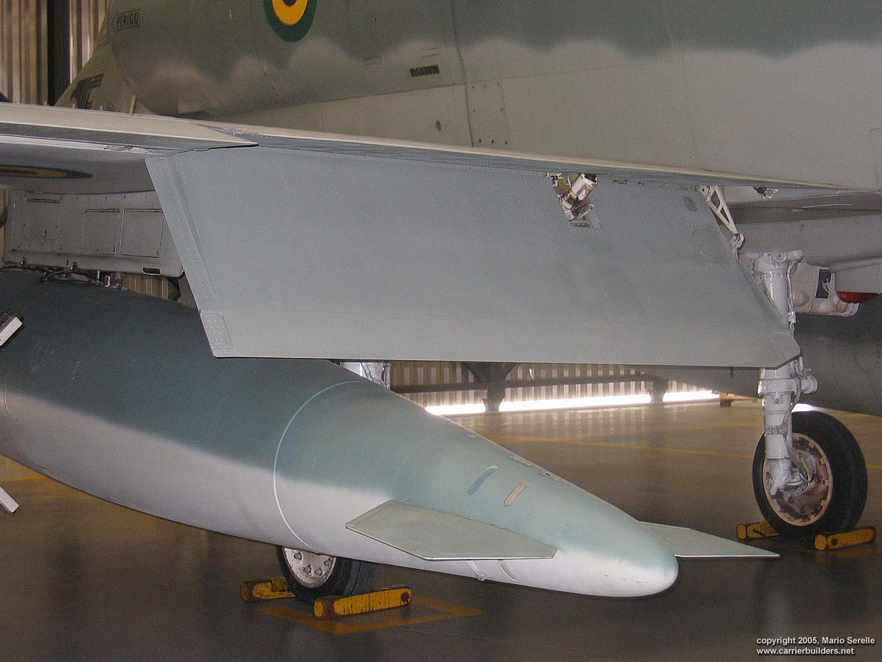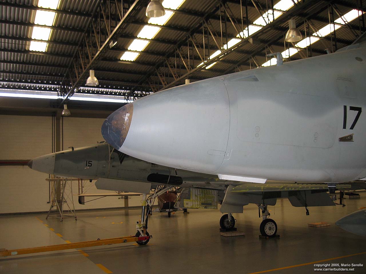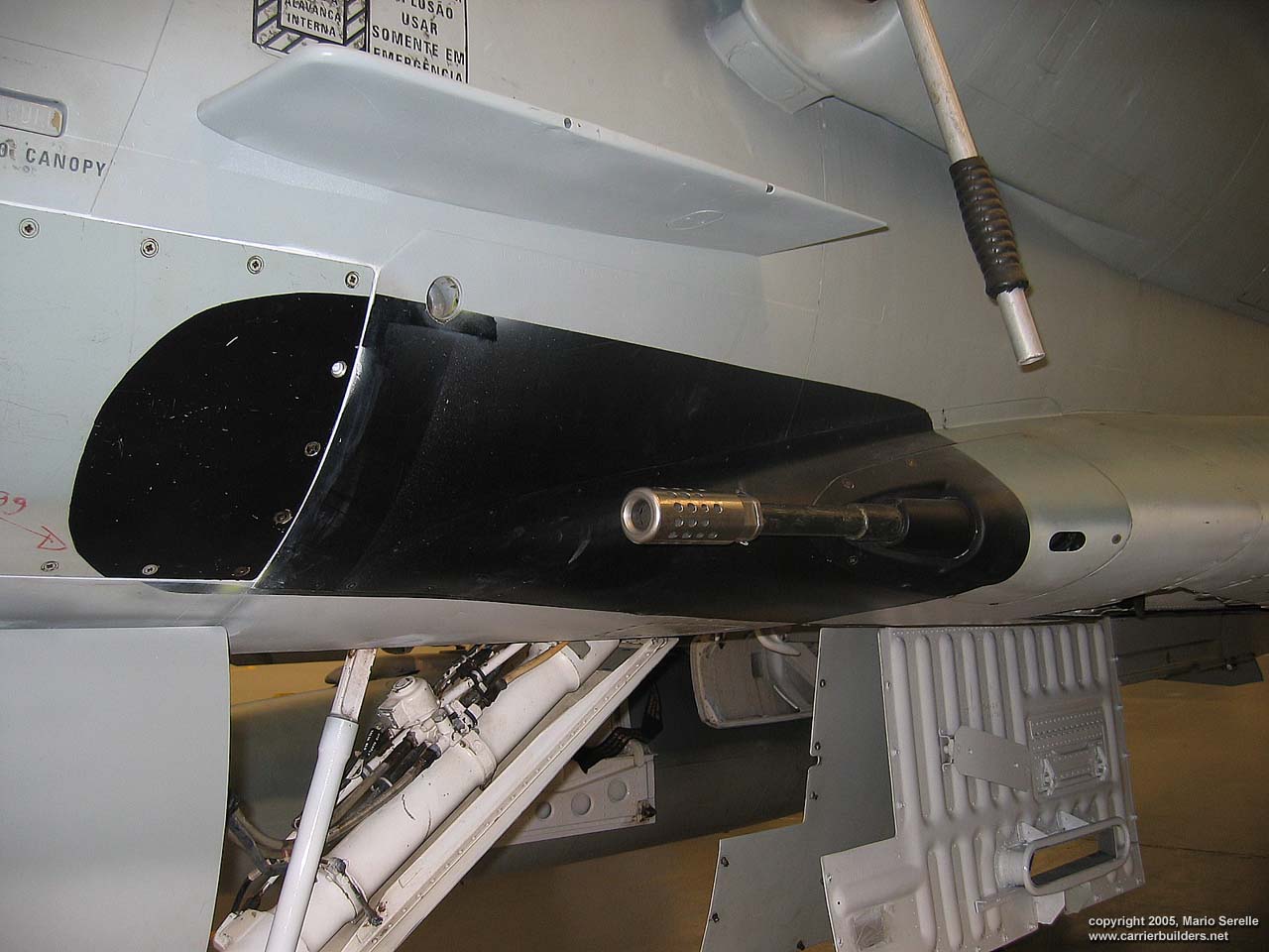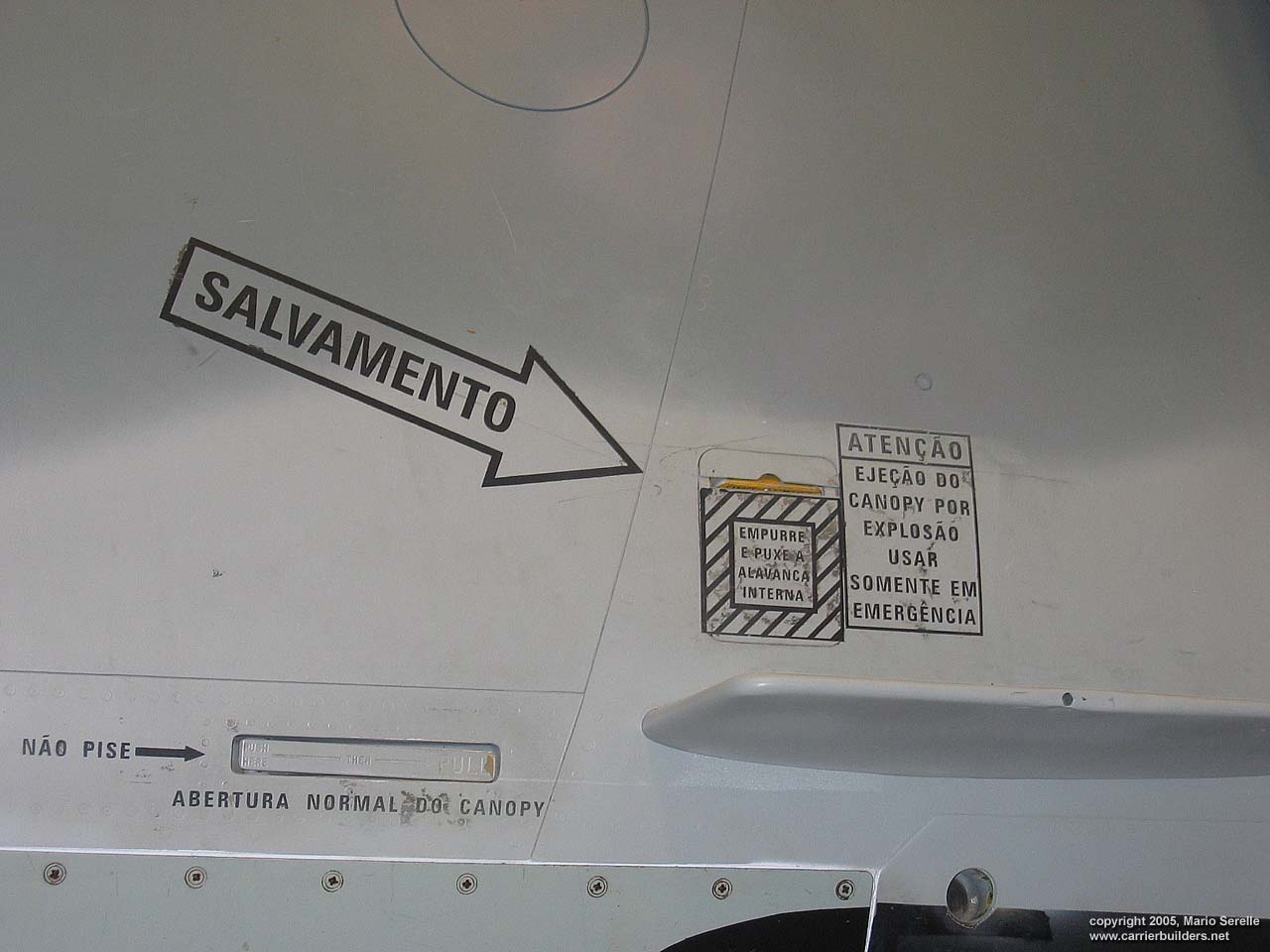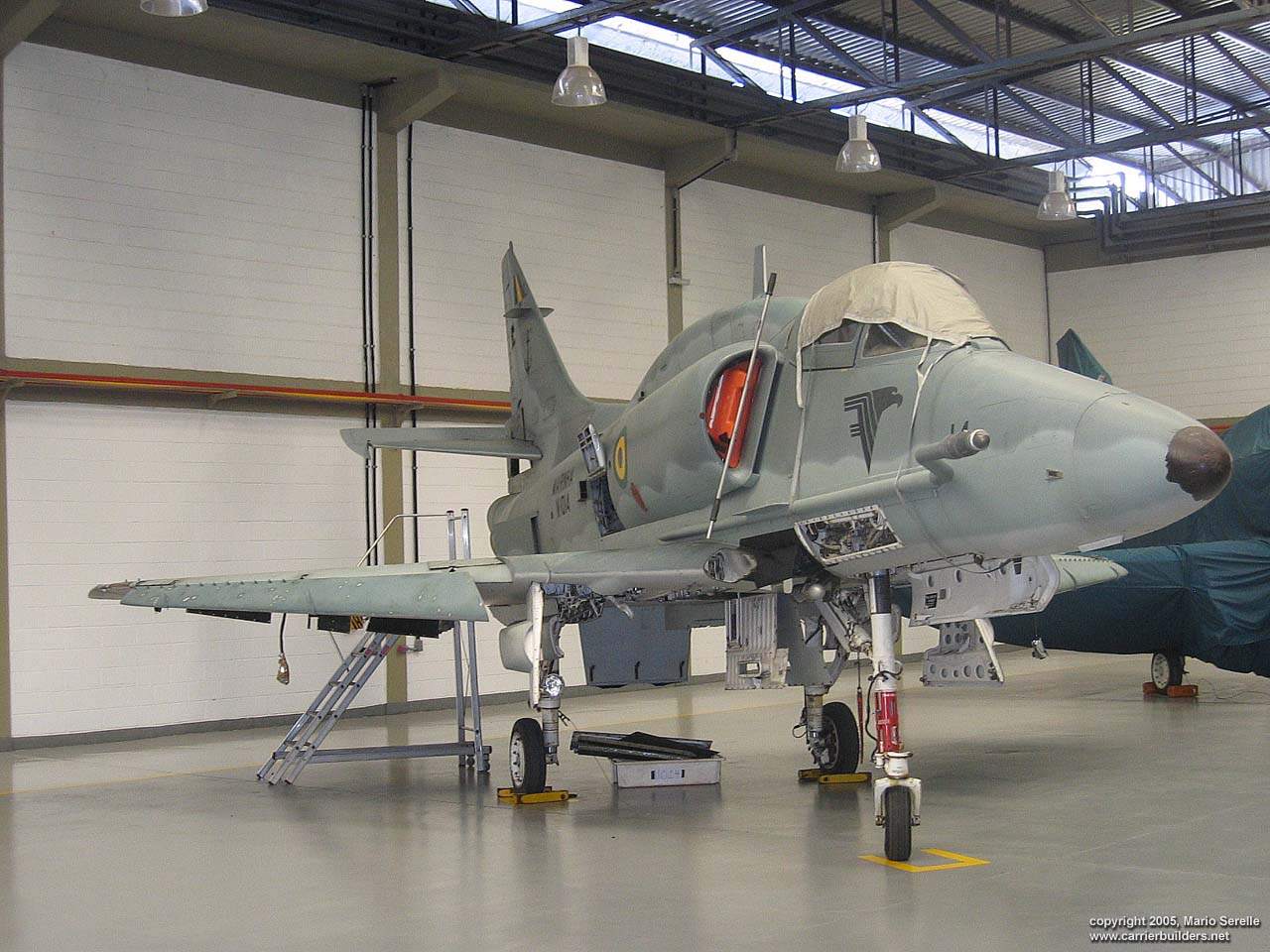 With United States cooperation, in 1997 Brazil negotiated a $70 million contract for purchase of twenty A-4KU and three TA-4KUs from Kuwait. These are operating from A-12 "São Paulo", former French Navy R99 "Foch". It was purchased from France in 1999. The Kuwaiti Skyhawks were re-designated AF-1 and AF-1A. 1280 pixel wide images! Photos © 2005 by Mario Serelle June 27, 2005 |