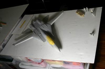 Because of the delays in the arrival of the figures, I set the positions with substitutes. Far left and right side of figures are from the Tamiya F-14 box. The second one from left is from the Academy F/A-18C kit. The second from right one is CMK resin kit. I did not use them except for one from Tamiya after all. |