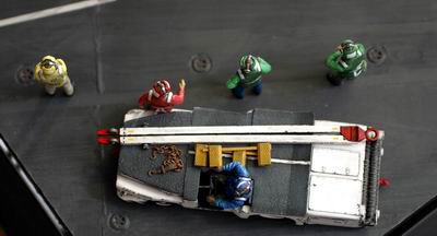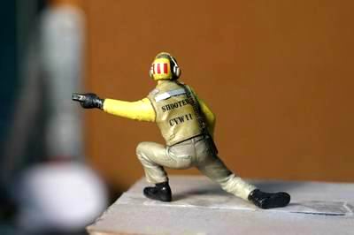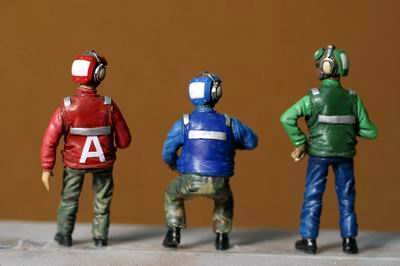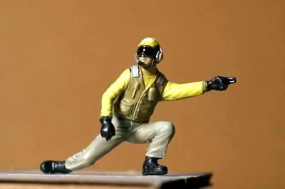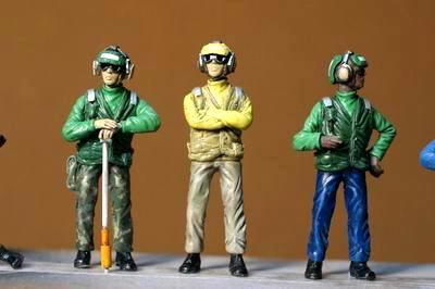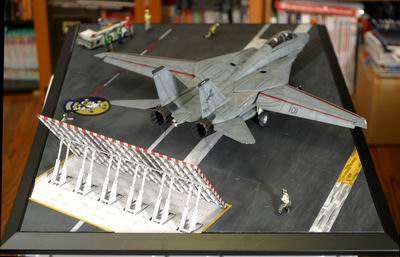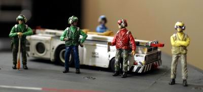 The tractor is also mounted to the deck with two brass wires. There are Tamiya wheel chocks, Flightpath tow bar and chain on the tractor. |