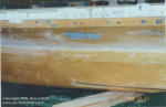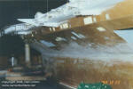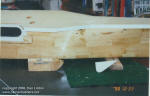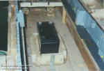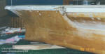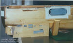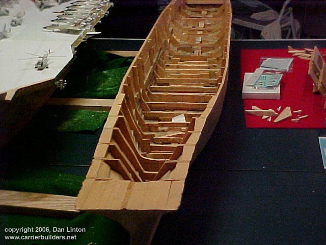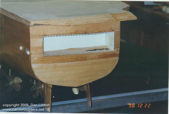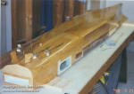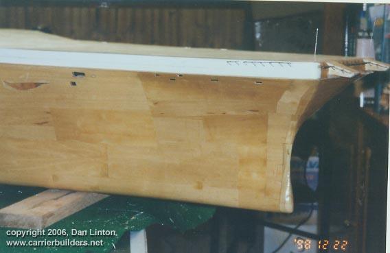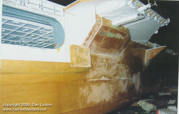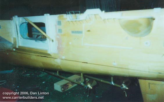 Pictures 1 and 2 show the type of hull I am referring to - pine on pine. The hull shown is not the Nimitz but the Ranger (CV-61), a project for the future. Once I completed the rec room of our new house five years ago, I set up a temporary (= summer months) workshop in the garage and went crazy building hulls. The furthest along of these hulls are the Ranger that you see and another Ranger (CV-4). When the fall came, and it was too cold to work in the garage, the Nimitz air wing got most of my attention. Next spring, back to the hull. This explains why the air wing was finished long before the ship. A pine hull over 85" (over two meters) long is very heavy but I did want something rugged. Picture 3 shows the Nimitz hull with 1/32 basswood sheathing, sanded and varnished, except at the stern. Bilge keels have been added, rudders, propellers, and shafts are installed. This is seen in more detail in Picture 4. The white area defining an elevator opening to the hangar deck was a separate construction and added to the hull (Picture 5). The white is styrene sheathed onto pine. The dark brown area of Picture 3 will be hidden when the port-side sponson is added on. Picture 6 shows the 12-volt battery which serves the two motors that drive the four shafts. (Picture 7).