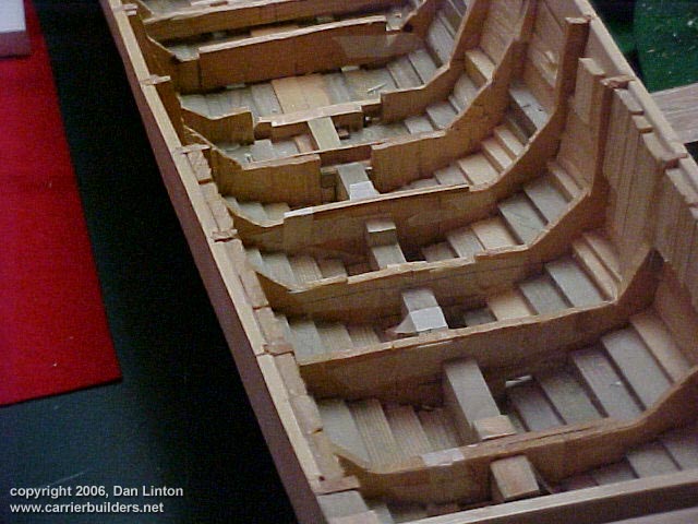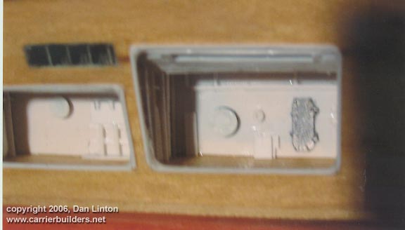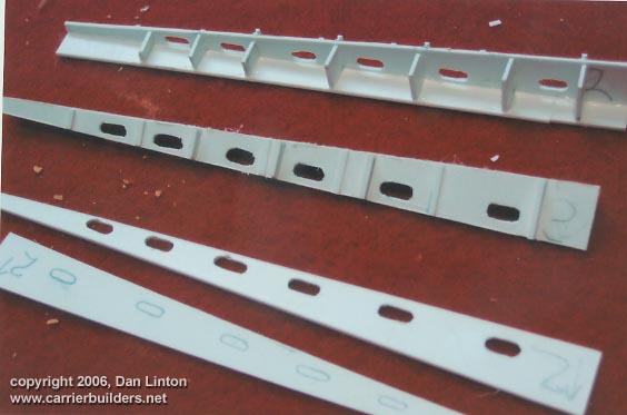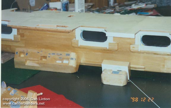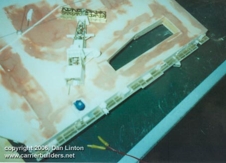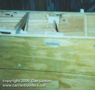 Picture 31 shows the beginning of construction for the elevator support structures. Interestingly, and most irritatingly, these were too large and had to be narrowed considerably. The amount of detail I have provided/am obliged to provide is light years away from what I anticipated when I started this project. The credit for this (and perhaps the blame for extending the time taken) goes to three gentlemen: without their involvement I would certainly had much less satisfaction in this build. The first of these gentlemen is Tim Barron. He sent me hundreds of pictures he had collected from US Navy websites and dozens of those pictures were absolutely vital in allowing me to clearly see details that would otherwise be obscure. Tim has created an excellent diorama in 1:2400 scale and I would urge you to go to our membership list and click on his website. The second gentleman is Kurt Greiner. Kurt is the webmaster of WarshipModelsUnderway and as a business runs Sea Photos. He was very helpful in selecting shots that I needed, particularly of sponsons and the underside of flight deck overhangs. The pictures I purchases from him were well worth the money.The third gentlemen is Ray D. Bean whose two CD's, one on the Nimitz class and the second on the Nimitz after its mid-life refit, have to be one of the great bargains on this planet. It would be great if every carrier had a CD put together by Ray. Because my computer is upstairs, and the model is downstairs or in the garage, the CD is less flexible for me than the pictures: on the other hand, the CD shots can be expanded greatly on the computer screen, adding new dimensions of detail and of understanding what one is seeing.