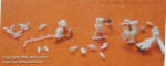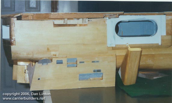 Picture 10 shows the sponson between elevators #1 and #2, and the area under the island. Picture 11 shows the crane support and rear sponson on the starboard side. Picture 12 shows the stern and it is a mess. Errors in measuring that original Monogram kit showed up here -the stern opening was too high, not level, and the roof section was inaccurate and had to be torn out. Pictures 13,14,15,and 16 show the portside sponson installed in place. The sanding marks show that another coat of varnish will be necessary before painting can begin. Picture 17 shows the installation of the foreward starboard sponsons and the accompanying sanding marks. Picture 18 shows the sponson between the forward elevators. Picture 19 shows the sponson under the superstructure and Picture 20 shows the crane support and rear starboard sponson in place. And Picture 21 shows the stern: it is no longer an embarrassment. Picture 22 is somewhat blurry but it attempts to show the inside of a refueling/replenishment station. There is much more detail to add but it makes no sense to do so until some painting is done. Picture 24 and 25 show pieces that go into other stations. Picture 26 and 27 show other structure (BPDMS launchers in Picture 27) that will be added once painting is done. Ships boats, accommodation ladders and supports, and the rear portside exterior walkway must also be completed.