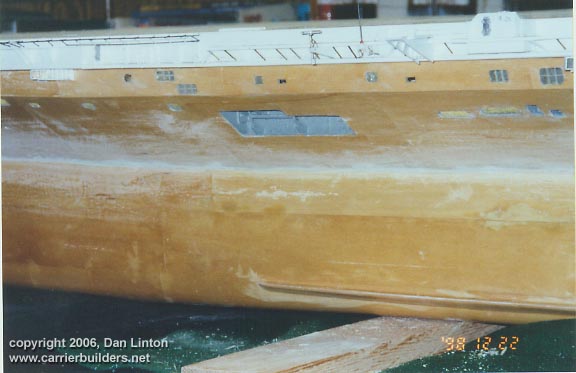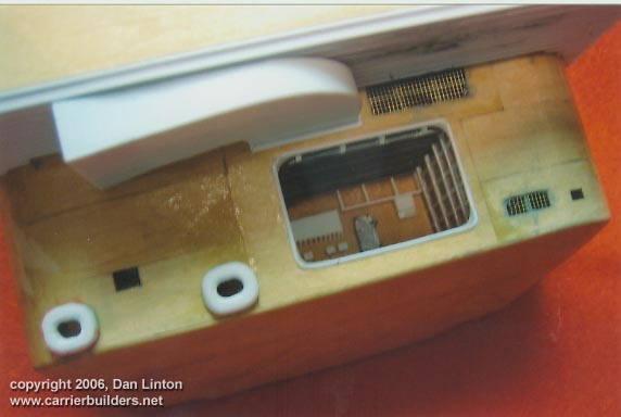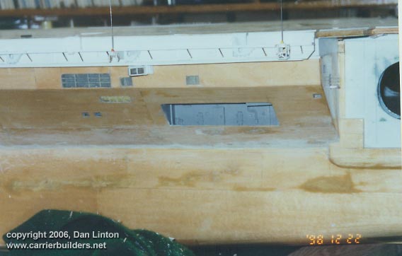 Picture 28 is fuzzy (my digital camera was broken and I had to use a disposable for some of these shots) but the brass I-beam sticking out from the hull goes under and supports a part of the flight deck called 'the finger'. It has been made removable by hand so that when the flight deck is removed, it too can be taken away from the hull. The anchors (not seen) are white metal from John R. Haynes. I was able to have the flukes on one (but not the other) rotate on its shaft. This anchor, on the port side, can be positioned fully up or in any position down (almost ½ meter of anchor chain).