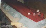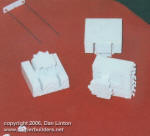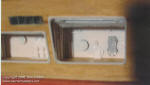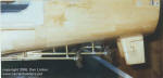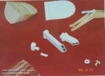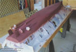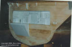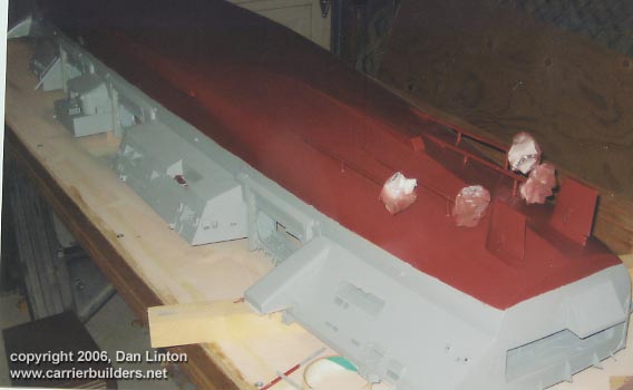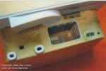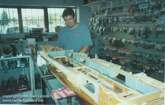 There is a fourth gentleman who must be acknowledged in this article. His name is David Henry and he is the fellow in Picture 32. David works at Pinnacle Hobbies, 5970 16th Ave, Markham, Ontario (pinnaclehobby@rogers.com), a shop north-east of Toronto. Besides being reasonably close to where I live (11 km/ 7 miles), Pinnacle Hobbies specializes in radio-control. Their main business is cars and aircraft, but their forte is radio-controlled helicopters. Putting RC into a ship is a piece of cake for these men. On Wednesday, Sept.7, 2005, I brought the Nimitz hull to Pinnacle Hobbies at 10:00AM. It was put, as you see in the picture, on top of a glass counter and Dave went to work - and of course, customers came into the store, so working on the hull was done in fits and starts. By closing time, 6:00 PM the main effort was complete. Control of the rudders and propellers for speed and direction is basic but added is a radio channel which causes a servo arm to move a toggle switch - and this provides power to two micro-motors (the blue areas in Pictures 33 and 34) that rotate radars at 20-30 rpm. There is a switch hidden under the sponson below the superstructure and beside it is a plug that allows the main 12-volt battery to be re-charged without having to remove the flight deck. Dave went out of his way to make everything as convenient as possible for me. Thank you David. Pictures 35 and 36 show the hull being painted in the garage. White Ensign Model (WEM - one of our sponsors) naval paints were used throughout. The red spot seen in picture 36 inside the sponson that is under the superstructure, is the switch mentioned in the previous paragraph. And picture 37 is the spray booth I built out of plywood. The black lines are wires that are adjustable so pieces of different sizes can be hung, painted and left to dry. The white area in the upper left of the picture is a side door into the garage: when the main garage door is open, the flow of air through this side door provides excellent ventilation. The small parts shown earlier, handrailings, and decals remain to complete the hull. Meanwhile, work continues in other areas.