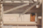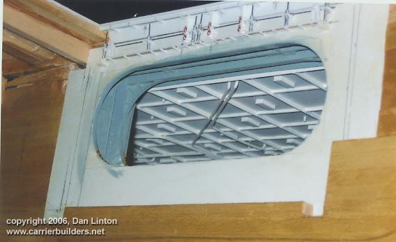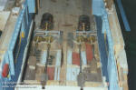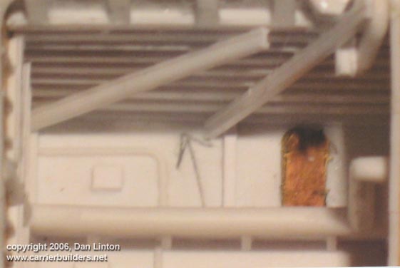 Picture 30 shows the area above the hangar deck opening but below the flight deck. There are tubular structures here and narrow catwalks (handrails to be installed after painting this area). The tubular structures have a steel extensions (seen here in part as lengths of piano wire) which push upwards and force a horizontal railing out of the flight deck as the elevator goes down, thus creating a safety railing for flight deck crews. When the elevator goes up, this railing retreats into the flight deck.