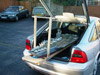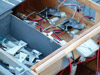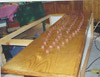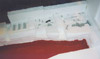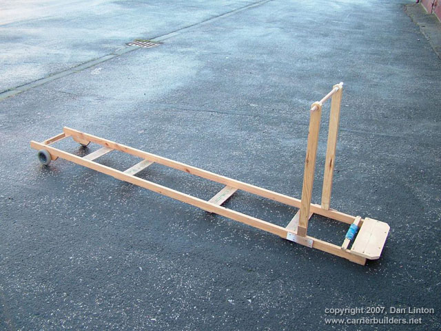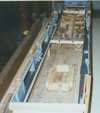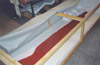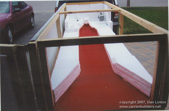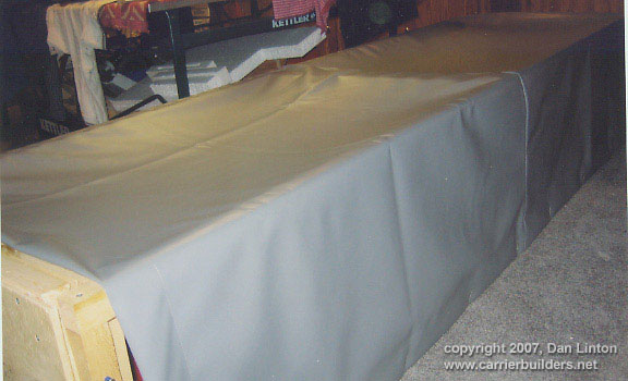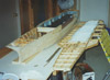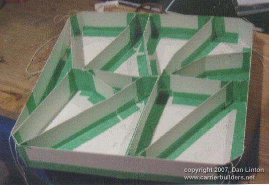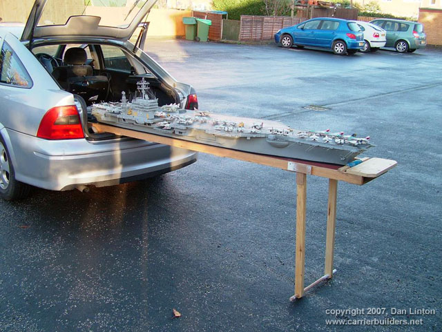 Picture 1 shows a 1:144 USS Nimitz CVN-68 in its 1975-80 configuration gliding across a pond --- but it is not my Nimitz. This model, completed a few years ago, was built by Mr. Ted Parr. I knew of its existence from a photograph or two in Model Boats magazine, and references to it with some further pictures on the ModelWarships.com website. These were sent in by Dave Wooley (author of the new modeling book Warships and Warship Modelling). I contacted Dave via e-mail and explained what I was doing in Part VIII of this build article and he provided me with Ted Parr’s phone number. I bought a long-distance calling card (Canada to England) and Ted and I had a pleasant chat for an hour, discussing our respective builds. Picture 1, and the next eleven that follow, were taken by Ted at my request and sent to Dave Wooley (Ted does not have an Internet connection), who graciously e-mailed them to me. Much of the conversation between Ted and myself dealt with philosophy – why is one building a model in the first place? Consider large scale builders and museum models: their total purpose is display, thus they are exquisitely detailed but static, having no moving parts, no changing of what is seen behind the glass. At the other end of the spectrum are the wargamers (usually 1:144 scale) where detail is sparse since the model is expected to be sunk, retrieved, and repaired to fight again, many times. Hulls, and turrets and superstructures will be dimensionally accurate but no one would bother with hand rails. Ted Parr’s Nimitz, and my own, fall between these extremes. A 1:144 scale Nimitz is 91”(2.3m), will weigh 65-85lb(30+kg) and is awkward to transport. Pictures 2,3,4,and 5 show Ted Parr’s ingenious solution to the problem of moving a large model with a small car. I think this simple device is nothing short of brilliant. And of course, Ted must be brilliant since we both started our models without good plans and each made a hull by scaling up the old Monogram 1:800 Nimitz, --- and both finished by using Aber hand-wheels (fret SV-7) for our fuel hose reels (even though they have only 5 spokes instead of the correct 8). The next three pictures – 6,7, and 8 –show the model on its carrying rack and shows a design choice: all the aircraft, crew, and the superstructure and radar tower are glued into place. In the tug of war between display elements and ‘working’ or radio-control features, Ted’s decision was to emphasize the ‘working’ or ‘sailing’ qualities of the model. Ted’s access to working gear is through a section of the flight deck (Pictures 9 and 10) and he chose not to have a full hangar deck. Some features are as ingenious as the traveling rack: for example, over 300 crew populate his model. They are beads of solder solidified onto wire and painted: close-up they appear not fully 3-dimensional but move back only a foot or two and there exists a crowded deck (Picture 11). Picture 12 is another shot of Ted’s model on the water. Ted gets out to a nearby pond for sailing more often than I can (that’s a function of climate: southern England is much milder than southern Ontario) and so to design with ‘good sailing qualities’ foremost makes sense. You can’t see it in the pictures but Ted’s model has two motors connected directly to two shafts: otherwise, it is a totally faithful and excellent scale model with superb details. In the tug of war between ‘display’ and ‘working’ elements, my build was different from Ted’s. I assumed that I would only take the model out about three or four times in a short summer season, thus ‘display’ would dominate over ‘working’ or ‘sailing’ features. Nonetheless, I designed the model so that the entire flight deck was removable since I didn’t want gaps in the flight deck which would only become more visible over time and repeated use (Picture 13). But I still had the floor of the hangar deck to remove to gain access to the running gear (Picture 14). LESSON #1: do not design a flight deck to be totally removable - unless it is 40” (1.1m) or less. A 91” flight deck is too long and the shape is too awkward for easy handling: it takes two people to remove the flight deck. I intend to build other carriers and will experiment with separating the hull at the water line: my next radio-controlled effort will be 58” or 1.4m long and if it works than I will try it on larger future carriers, such as an 87”or 2.2m USS Ranger CV-61. LESSON #2: minimize the work in the hangar deck. I learned this lesson during the build and became less and less ambitious and detailed over time. In a sense I was lucky that the new CD’s (particularly those from Ray Bean) arrived after I had done the major work on the hangar deck --- otherwise I would go detail crazy and still be working on the model. LESSON #3: pay the price and do the work now. Ted Parr’s Nimitz goes from the pond, to his car, and then into a shed/workshop: it never goes in his house. My garage becomes a workshop from late April to early October, but once temperatures dip below 15C (60F) then painting and gluing are no longer possible and the model has to be brought into the house (as I write this it is mid-January 2007 and last night’s temperature was –16C). So the model has to be transported in and out of the house by hand (a two-person job) and a separate carrying case was built for it to transport it by vehicle to a pond. Picture 15 shows this carrying case – 8’x2 ˝’ x 1 ˝ ‘(2.5m x 76 cm x 45 cm). The model slides into the case bow-first along the red felt, kept in place by the white styrofoam blocks. Pictures 16 and 17 show that other styrofoam blocks have been used to carry antennas, JBD’s, and elevator cables. The unfinished superstructure is seen here but once it was detailed and rigged it had to have its own separate carrying case. Pictures 18 and 19 shows the heavy canvas covering for the box. My wife bought this and sewed it for me