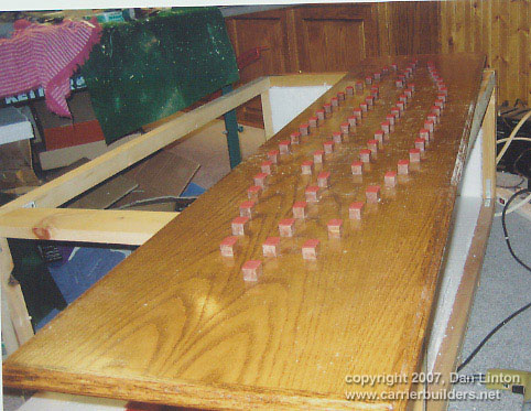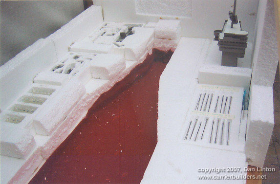 LESSON #4: forget lighting. Picture 30 shows faintly the superstructure lights on. I had intended to light up the ship’s numbers ‘68’ and had toyed with the idea of lighting up the hangar deck and the runway lights on the flight deck. I decided, however, that the time and trouble involved is not worth the coin. I have two rotating radars and if I had the talent to make working elevators and/or JBD’s I might be tempted, but not lights. I now many other modelers do wonderful jobs with lighting but its not for me.