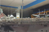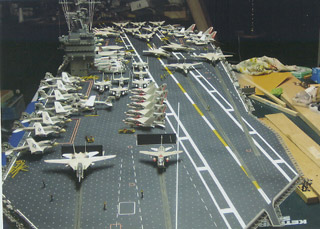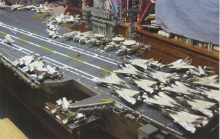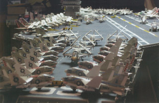 LESSON # 5: restrict ambitions. This lesson not only applies to lighting, but to another idea. If you look again at the plaque in Picture 27, you will see 1975-82. I designed the model so that it could display a scene that would be accurate for any point in those years. Even in this I was not 100% successful. From 1975 to 1977 the Nimitz had no lights inside the superstructure numbers ‘68’ and the twelve double antennas around the superstructure were shaped like cow’s horns rather than looking like television antennas. Otherwise, the model is reasonably accurate but at the cost of building more aircraft than is usually necessary. Picture 31 shows a number of F-4 Phantom II’s (from three different squadrons) at the flight deck stern that are only accurate for the first two cruises, as is the case for the RA-5C Vigilante. I have an extra SH-3 and an extra E-2C as well. In the future, only the aircraft from one air wing during a particular cruise will be done (or so I tell myself now).