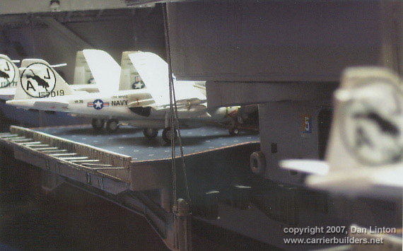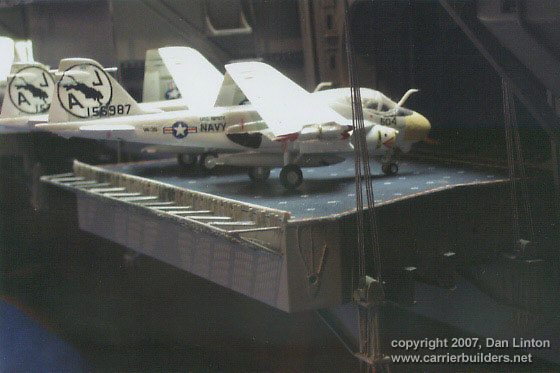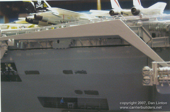 LESSON #7: decide about the elevators - either all up or all down or some combination and then glue them. Nimitz-class carriers have such complicated systems (see Part VI of the build article for more details) for their elevators that it proved not really worth the trouble to make them displayable up and down as I did. Picture 45 shows elevator #1, Picture 46 shows elevator # 2, Picture 47 shows elevator # 3, and Picture 48 shows the port side elevator #4. A workable elevator in this scale is beyond my abilities.