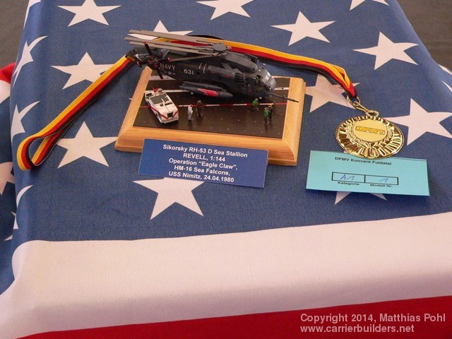 This is my actual built for my 1/144th collection of carrier based planes and helicopters. I used the REVELL kit no. 04032 of an HH-53 D, because my aim was to show a RH-53 D Sea Stallion of HM-16 “Sea Falcons” during the “Operation Eagle Claw”, the disastrous attempt of freeing the american hostages during the Iranian revolution in april 1980. During that operation the helicopters were painted in sand colors, but in the eve they show their colorful blue-grayish livery.