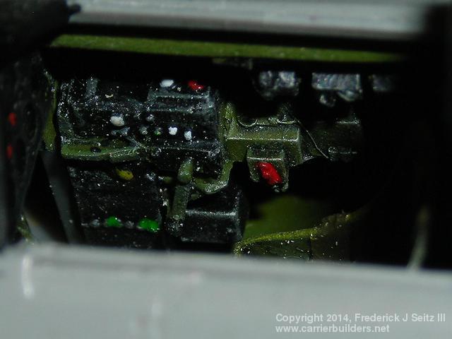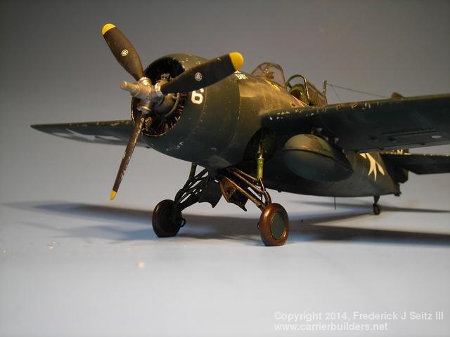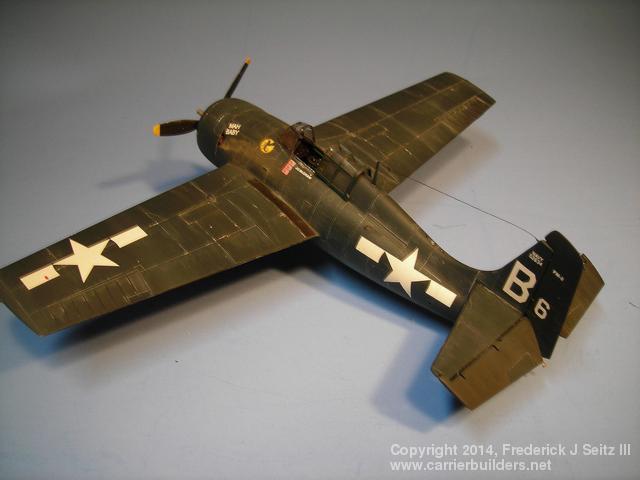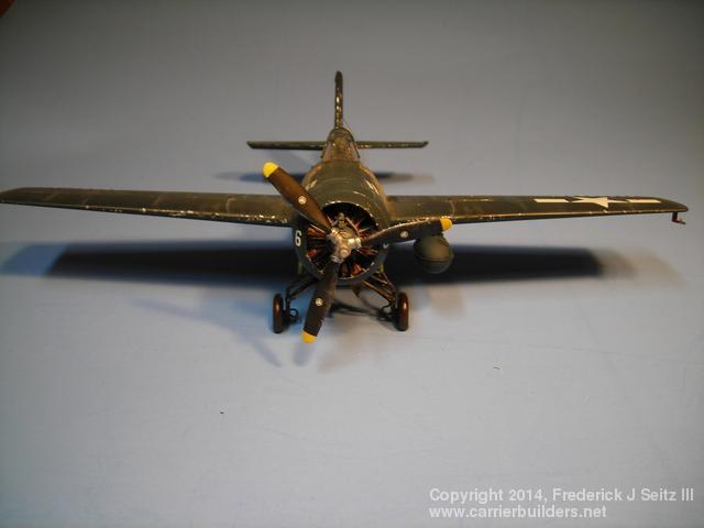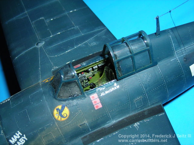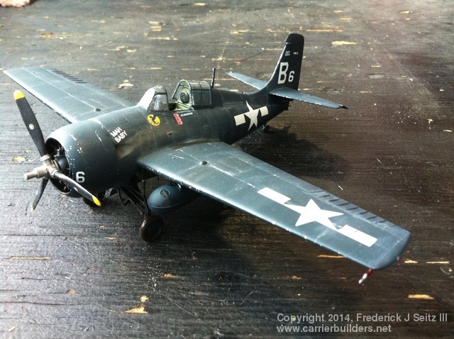 Hey Folks! It has been awhile since I last posted on this site. I have been busy building, but have not really done any naval subjects until recently. This is Hobby Boss' FM-2 kit, and as I'm sure most of you know, it has a whole bunch of problems if built straight from the box. To improve the kit, I used a couple of correction sets from Vector, namely the main correction set, VDS 48022 which includes the engine, wheel bay, cowling, exhausts and rudder. I also used Vector's control surfaces, (VDS 48025) a Cutting Edge prop, (CEC 48404) and True Details resin wheels. I further used a cockpit borrowed from the Sword's FM-2 kit. I was not thrilled with Sword's FM-2 kit, and the project sat on the shel with other stalled builds until Hobby Boss released their kit. I had a wild idea to see how the would stack up, and Swords cockpit fit into the Hobby Boss like a glove! While the Sword kit may lack much in the plastic department, the resin cockpit they supply is excellent. The Vector resin parts mate well and line up with litle or no trouble. Care is needed where the forward wing root and wing joins, but otherwise, it's a great addition and really mkes the model look like an FM-2. I would advise anuone thinking of building this kit, to get this correction set. The pictures will pretty much be self explanitory. There are a couple cockpit shots, one of the engine, and a few other overall pictures at various angles. I hope you enjoy reading this, as much as I enjoyed building her, as the names implies, she's "Mah Baby"!