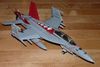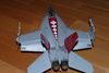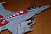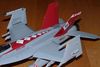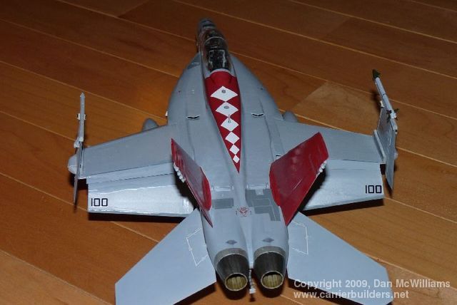 I used the kit red decals, rather than trying to match paint colours for the bright spine and tails. They generally went on very well, especially given their large size and the complex curves they had to cover. At the front and bottom of the vertical tails there were some small decal size problems. The bottom portion required very minor trimming, while the fronts needed trimming as well, plus a bit of Future to coax them not to separate away at the leading edge. I was a bit surprised to see that the navigation lights (tops of LEXes, plus sides of aileron actuator housings) were represented with decals in this kit. The lights atop the LEXes don't look too bad, but I had already painted the underwing nav lights before discovering the decals existed. The foot-walk no-skid panels were all decals as well. They were a bit thick and tough to get to sit down properly on the top rear; if I had been less lazy I probably would have painted them instead.
