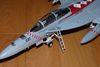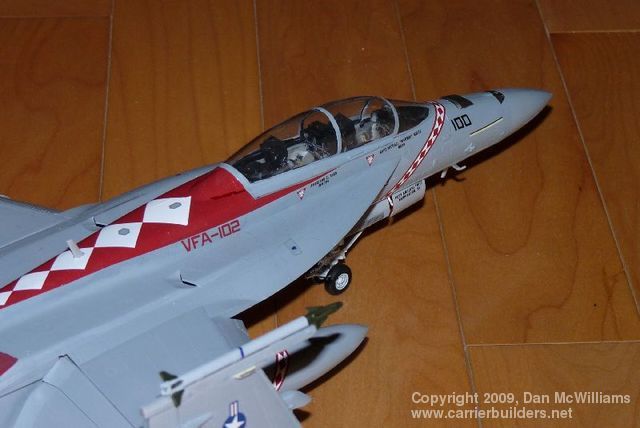 This build was done entirely OOB. It is the first time I've built a Super Hornet. Usually I build CF-18s, so after years of thinking I should build an E or F model, I couldn't resist when I saw the colourful markings that came with this one. I noticed some differences between this and the A/B/C/D Hasegawa Hornet models, such as the lack of photo-etched parts in this kit for HUD posts and other detail bits. Frankly, though, I found that this didn't make a big difference to me. The cockpit panels were strange - done up as decals with some raised detail as well! I tried the decals in one cockpit, and painting in the other - turned out I preferred the result when painted. The decals wouldn't sit in place, and required lots of setting solution to stay down. They also looked quite hokey.