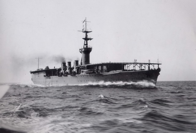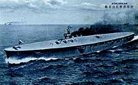 In December of 1919 the keel was laid for a ship that was intended as a seaplane/airplane carrier. Like British carriers at the time (the only ones in existence, one completed, two building) a cruiser hull was the basic form. It would be named Hosho or ‘Flying Phoenix’ and like its contemporaries its design would change as it was being built. The Japanese Navy wanted two carriers (the 1918 and 1920 programs) but in the end only Hosho would be built.(10) Very early it was decided that the ship would be a ‘pure’ aircraft carrier (11) so features such as a seaplane slipway and associated cranes at the stern were eliminated, just as they had been on HMS Hermes. In the summer of 1920 the Navy requested that a British naval mission be sent to Japan. After some diplomatic games were played, in November 1920 an ‘unofficial civilian mission’ was approved and early in 1921 Sir William Francis Forbes Sempill, RAF, and 30 technical experts arrived at Kasumigaura. Officially an officer in the RAF, Sempill had tested many naval aircraft and he hand-picked the members of the ‘mission’ which was expected to last a year. Along with the team came 100 aircraft – 20 different models, five of which were being used by the Fleet Air Arm. Using these aircraft, it was expected that 5000 hours of training for flight instructors could be accomplished during the year. (12) Note in picture 6 Admiral Togo with Sempill, this time by a Gloster Sparrowhawk. Private firms, which wanted sales, ‘attached’ additional personnel to the mission. Within a year, three different aircraft would be designed by these gaijins (foreigners) to be used on Hosho, a ship being built to carry aircraft but at the time of its building there were none. Quite literally, the Japanese carrier navy began from nothing. Hosho, at 7500 tons standard, was much smaller in displacement than her contemporaries HMS Argus and USS Langley but she was much faster at 25kts and could carry as many aircraft (21) on a flight deck of almost comparable size. (13) As with Argus, the forward flight deck was sloped downward and came almost to a point at the bow; as with Langley, she discharged gases through hinged funnels (there were three of these amidships). (pictures 7 and 8) She had 4 5.5” guns with two 3” H/A anti-aircraft guns but these latter were sited on the narrow deck. As built she had a small island forward on the starboard side (picture 9 is a post-card showing a fanciful and inaccurate Hosho) but pilots objected to its presence as the deck was already very narrow. This original island was a hazard and was far too small for navigation, air traffic control, and gunnery fire control to be effectively managed, thus by 1924 Hosho became a flush-deck carrier and flight operations were controlled from an operations platform beside the flight deck. (14)(pictures 10 and 11) Designed with British assistance, it was too be expected that her landing apparatus would be a set of longitudinal wires (the ‘Busteed Trap’) designed to keep the aircraft travelling straight until a tail hook caught a transverse wire. But the hooks on a bar between the undercarriage struts would often cause a nose-over on landing, thus many pilots lost teeth or even consciousness when slammed against the cockpit. (15) Soon it was realized that the system was unnecessary and was removed. (16) Commissioned in December, 1922, the first take-off and landing occurred with William Jordan, ex-RNAS working for Mitsubishi, flying a new Type 10 Carrier fighter. One month later Shunichi Kira became the first Japanese pilot to land on a carrier. (17)