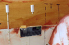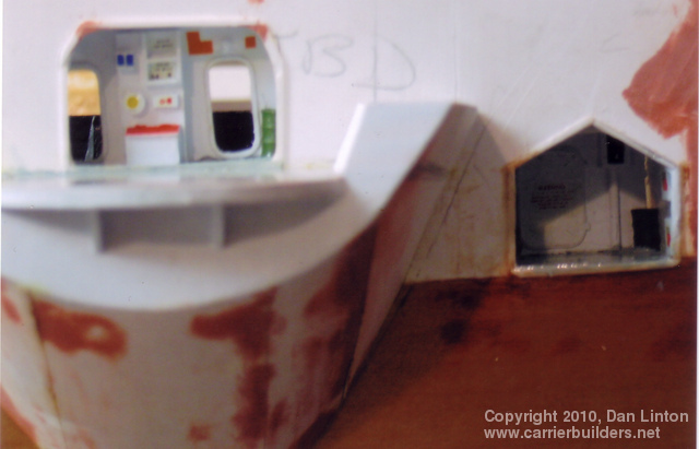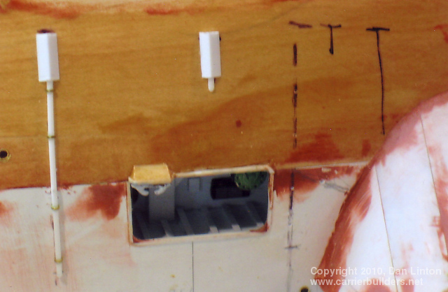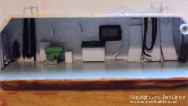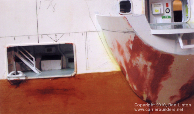 The forecastle comes to us from ships of the late Middle Ages but in the transition from wood to steam this feature no longer really exists. Today, this forward part of the ship at the bow is often called the ‘anchor deck’ or ‘cable deck’ or ‘chain deck’. Nevertheless, the term persisted in the Royal Navy (shortened to the strange looking fo’c’s’le, pronounced “fawk-sill”) and was passed along to the Bonaventure. For the Bonaventure I had good detailed plans of this deck but I did not know what colour it was to be painted. Through the ‘Under the Cat’ website mentioned in Part 1, I sent e-mails to five gentlemen who were crew members of the Bonaventure in the early 1960’s. I received three replies. Vernal Smith and Ron Serink indicated that this deck was painted non-skid green, essentially the same as the green used on the flight deck. Charles Waring stated that the deck was painted dark grey with black anti-skid strips. Picture 34 (above) shows the beginning of the construction of this deck. Picture 35 shows this deck fitted inside the hull. It was at this point that I needed to decide upon the colour and, being so advised by two of three respondents, I went with green (see picture 36). Picture 37 shows the deck almost completed: the gloss paint needs to be dulled to flat. Interestingly enough, when the flight deck is placed over the fo’c’s’le, it looks very much like…….dark grey. All the respondents agreed that the quarterdeck was planked and stained similarly to the teak that formed the topmost rail of the handrails. Unfortunately my plans did not show this planking (perhaps removed in the 1966-67 refit) and so what I produced was meant to be a steel deck (see picture 38). Picture 39 shows the quarterdeck in place: it was already in place when I received the e-mails that it had been planked. Too late! I wasn’t going to rip it out and start again, so…..picture 40 shows a quick brown paint coat and picture 41 show the top bulwark (‘ceiling’) in place. Given the fact that the stern and aft openings in the hull admit very little light (picture 42), the lack of planking here is not a total disaster. Next: Part 3 – the Flight Deck, Elevators, and Hangar