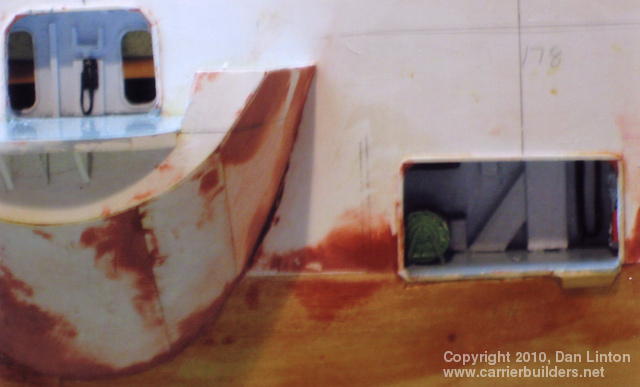 Bonaventure originally had five boats, each having its own storage by a hull opening, with handling gear for lowering to and raising from the sea (note again picture 1 above). Since the carrier spent most of its service life in the North Atlantic (side trips to the Mediterranean and Caribbean were welcome but she was also sent on a cruise to the high Arctic) and had more than its share of storms (no weather recon satellites in the 50’s and early 60’s), these boats were often damaged. Considered as not worth the trouble, four of the boats and their associated gear were removed and the openings were plated over during the major 1966-67 refit. However, I was depicting the ship before that overhaul, so all the boats and the openings had to be included. Picture 21, above, shows one of these openings: missing are the ship’s boat, its cradle, and the overhead pulleys. What is seen is mostly guesswork – I have one picture where the boat is absent but it was grainy black and white and only the left side of the picture, roughly from the thick pipe to the left, has any accuracy. And even then the colours are guesswork. Everything to the right of the pipe is pure conjecture (especially the writing) put there to ‘look good’ and knowing that once the boat is in place, very little of this bulwark can actually be seen. Picture 22, below, shows the two openings for the ship’s boats immediately aft of the superstructure on the starboard side. Again, guesswork and fantasy, especially for the top bulwarks (‘ceiling’). Every single opening require back, side, and top bulwarks (‘walls’). Pictures 23 to 25 show numerous bulwarks: again, all guesswork. Picture 26 shows the opening for crew access aft of the starboard gun support and the opening in the hull leading to the gun deck. Picture 27 is the area on the starboard side directly under the island. Picture 28 shows the opening to the gun deck, starboard side forward, and the small access area used for bringing in supplies towards the bow. Picture 29 is another opening for a boat (midships, port side) which, because of another grainy black and white picture where the boat was absent, is a bit more accurate than the others. Picture 30 is a match for picture 26, only this time it is on the port side aft. Pictures 31 and 32 show the support bars for the wire cables that raise and lower the boats. Picture 33 is a repeat of picture 14: this time look for the pulley supports at the openings for the ship’s boats and notice how far from the hull they extend.