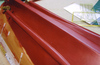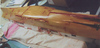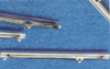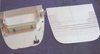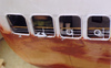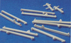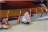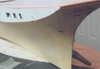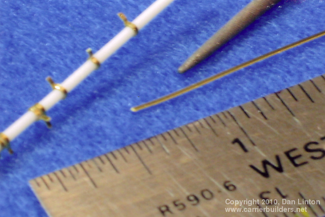 Bonaventure had eight major sponsons. Four supported the four twin 3”50cal. guns and they were quite large and deep; two supported the mirror landing lights; and the final two were general-purpose storage areas. Picture 11, above, shows the two general-purpose sponsons and one of the gun supports. They are shaped balsa wood cores with a sheath of thin styrene (10/1000”) glued on with two-part epoxy resin. This is seen in more detail in pictures 12 and 13 below. Picture 14 shows the port side of the ship with the two gun support sponsons , the mirror array support (narrow triangular structure) and the general purpose sponson forward. Note the large number of openings in the hull. Picture 15 shows the starboard side of the ship but at this stage the support for the starboard mirror array (Bonaventure had two of these systems, one on each side) has not yet been attached. Pictures 14 and 15 also show the numerous drain pipes – over two dozen – found along the side of the hull. These pipes were made from styrene rod (two different thicknesses) and attachment brackets were made by wrapping a spare, thin, length of photo-etch brass around the styrene using needle-nosed pliers (see picture 16). Snips were used to leave a small triangular flange at the end of each bracket – this would then be pushed into a small hole pre-drilled into the hull and secured with CA glue. Then the bottom pipe would be covered by a styrene triangular piece – on the actual ship this protected against constant wave action breaking off the pipe (see picture 17). The triangular pieces were hollow to all fluid drainage at the waterline. Pictures 18 and 19 show line-ups of these pieces before painting, and picture 20 shows that the hull was painted in sections, those sections being defined by the drain pipes. Picture 20 also shows some of the numerous portholes on Bonaventure, a feature all but eliminated on modern carriers.
