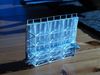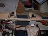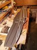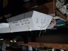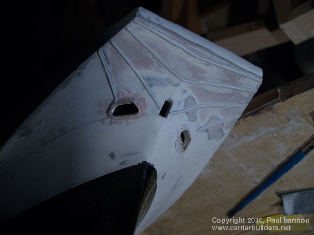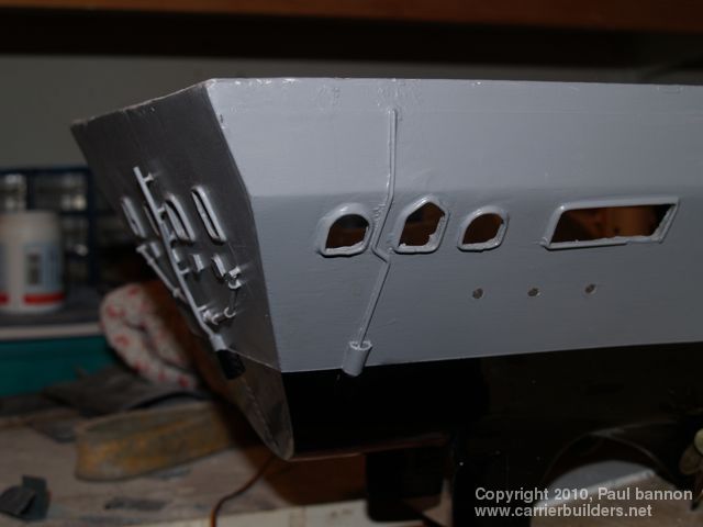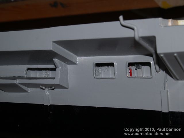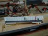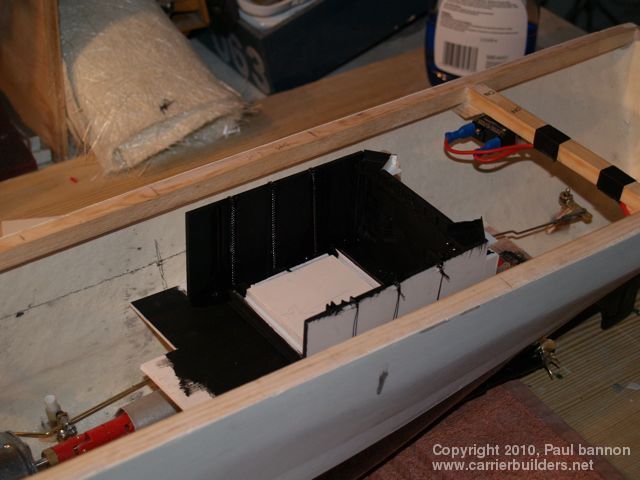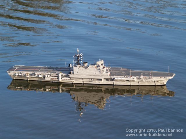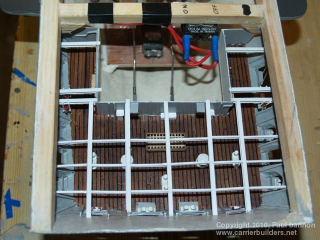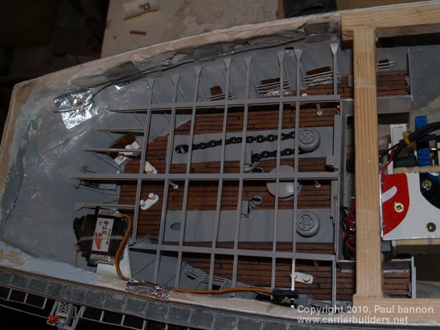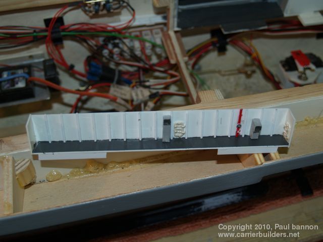 I like to build my sponsons to the Flight Deck, the reverse of the way most people seam to build. If you have accurate plans then building the sponsons first is OK as the same plans will give you a Flight Deck that will fit and look correct. As most of the work on the Hermes has been from pictures and the Flight Deck being the second ( the Hull being the first ) most obvious part of the model, and knowing it’s width then the deck needed to be built first, then sponsons can be adjusted to the deck The Flight Deck is made from plastic as used by professional sign makers and is, I think, expanded foam. It comes in eight foot by four foot sheets so the size of your deck can normally be accommodated. The Hermes deck is about five foot long. It’s easy to cut and sticks to itself or styrene very well with Superglue. All the cut outs were made before work was started on the sponsons and weather decks. At this stage I learned how difficult it is to lay up fibreglass in a consistent thickness. My way around covering this mistake with thick edges to the cut outs was to cut down the inside at as steep an angle away from the opening as possible.Also fitted were the drains that run down the outside of the hull and copper wire around the openings, wich were back filled to give the re enforced look. Having established the shape of the flight deck and having located it by glueing styrene strip to the edges where the deck runs flush with the main hull, effectively creating a ‘lid’ Some basic painting of lines was also done at thi stage. I then began working down each side building the sponsons from a lightweight quarter inch ply and the weather decks from styrene sheet. These were built off the hull, detailed, lit and then fixed in behind the appropriate opening. Quarter Deck and Cable Decks were built in situ, planked, detailed, loose roof girders built up and then a sheet of styrene with lights placed over the girders. The weather decks can be seen but the Cable and Quarter Decks were a little over the top as they cannot be seen from the outside. Cat Walks were also built up off the deck having traced the curve onto some card beforehand. The mesh in the base of these is painted household net curtaining. Many different patterns can be obtained and when sprayed becomes stiff. I should say at this point that wherever styrene had to be stuck to the hull, the hull was sheathed in very thin styrene stuck down with cockpit glue as used by plane modellers. I like to make as much of a model as I can. I know that photo etch can produce some beautiful results and if you are good at soldering ( I am not ) brass wire gives good results. I use Styrene for most of this work. An example is the railings which are made on a small jig. The long runs are laid out through groves over a drawing showing the uprights. These are then cut oversize, the long runs blobbed with glue and the cut uprights put in place. After about 12 hours these have welded solid and the surplus trimmed off. I make one extra rail ie 3 rail is made as 4 rail, the fourth rail is glued down onto the deck - a small amount of extra strength. Ships boats were basically just hulls - at this time almost everything had to have a cover and this makes life so much easier, less detail required ! Life rafts were pieces of dowel with the ends rounded on the lathe, glued into groups of four and covered. All covers are cut from white supermarket plastic bags. On modern vessels you have to show more detail as the rafts are in cases with Hydrostatic couplings - something that was not around in the mid sixties. (Part of my basic training was how to push the life raft into the sea, then find a lanyard to pull to inflate the raft and climb in. Difficult enough in the swimming bath - I never had to try it for real.) Lifts (Elevators ) The system used here was similar to that used on my Truman. All lifts on the Hermes were chain operated - huge bicycle type chains - the aft, centre line lift with four per side and the deck edge lift with one per side. It was not until after the Aft lift was built that i discovered it had four chains per side, up until then I could only see three - so three it is. The chains were from a ladies necklace which as the nearest I could find and in practise only appear on the Aft lift - the run that had to be used on the deck edge lift was to complex and I had to revert to nylon cotton running in black slots. On the aft lift the chains change to nylon cotton after passing over the edge of the lift box and down to the brass tube under the box which is driven by a 1:100 geared motor operating through micro switches top and bottom and a double pole double throw non latching switch, operated by a servo. Small pegs of styrene protruding from the underside of the lift deck catch on the deck and level the lift as it comes to the top. The same principles are used to operate the deck edge lift.. I was anxious to get the warning sound working as the lifts go up and down - the nearest I could find was a cycle bell which you ‘flicked’ each time you wanted it to ring. This was attached to a geared motor with a ‘flicker’ arm that is powered off the lift operating motor. Lifts (Elevators ) The system used here was similar to that used on my Truman. All lifts on the Hermes were chain operated - huge bicycle type chains - the aft, centre line lift with four per side and the deck edge lift with one per side. It was not until after the Aft lift was built that i discovered it had four chains per side, up until then I could only see three - so three it is. The chains were from a ladies necklace which as the nearest I could find and in practise only appear on the Aft lift - the run that had to be used on the deck edge lift was to complex and I had to revert to nylon cotton running in black slots. On the aft lift the chains change to nylon cotton after passing over the edge of the lift box and down to the brass tube under the box which is driven by a 1: