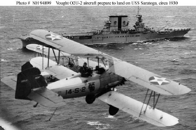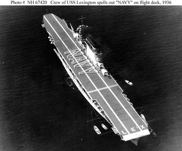 If any adult living in the 1930’s were to be asked what an aircraft carrier was, the image that would most likely come to mind would be that of the American giants, USS Lexington and USS Saratoga, for they undoubtedly had more publicity than any other such ships of their era, staring in a movie (picture1), and providing all the electrical services to a large town for a month! (pictures 2 and 3)(1). In terms of length the were the longest warships in the world (888’ or 282m) and were almost always pictured with their flight decks crowded with aircraft – and as the decks were maroon with yellow lines, and the aircraft sported bright yellow wings – they were among the most colourful warships ever (picture 4). And unlike the USN’s giant airships which were contemporaries and also gained much publicity (a future article will be written about the giant ‘flying aircraft carriers’), Lexington and Saratoga suffered no peacetime catastrophes. What happened on the decks of these two carriers, and in the exercises they undertook, made the United States Navy the leader in naval aviation, a position it has held for over eight decades.