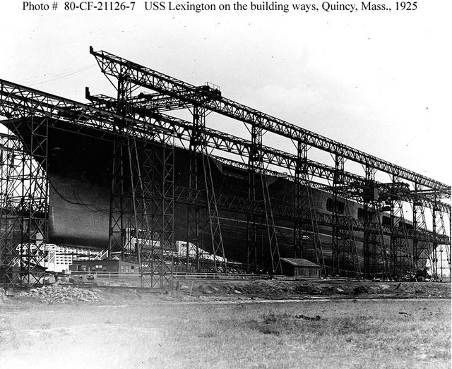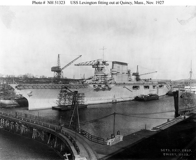 Endnotes: 1.”In December 1929, Lexington was recruited by the city of Tacoma, Washington, to provide electrical power as the normal hydro-electric source was threatened due to a drought. Such was the power generation capability of these ships that she was able to provide sufficient power to run the city 12 hours a day for 30 days until the crisis had passed. “ Lexington docked at Tacoma on Dec.15, 1929 and supplied 12,000 KW for 12 hours each day for a month until the city’s reservoir had rebuilt its water levels. The Navy charged the city of Tacoma 1 penny per KwH. Tacoma at the time was not connected to any national or regional power grid. Stern, The Lexington Class Carriers, pp.57,59 and Anderson “CV-2 CV-3 Lex and Sara” in Warship International, no.4,1977, p.313 2. Stern, op.cit., p.12 3. For anyone alive in the last half-century, it is almost impossible to imagine the United States not being a major military power. Yet in April, 1917, it had an army less than 1/3 the size of Canada’s and that army’s recent combat experience had been against Mexican banditos, Philipinne guerrillas, and Plains Indians. It took over a year to draft, equip, and give basic training to 1 ½ million men – but almost 100% of their tanks and artillery were British and French and over 90% of their aircraft. 4. Pawlowski, Flat Tops and Fledglings, 5. Stern, op.cit., p.12 The British G-3 design was often referred to as “Super-Hoods”. The Hood was completed but her sisters were not, being cancelled in 1917. Only two of the battlecruisers were actually laid down and none were named, although it was speculated they would repeat the names of the first battlecruisers – Invincible, Indomitable, Inflexible, and Indefatigable. 6. Preston, Aircraft Carriers, p. 35 7. The British had only the slim ‘Baltic cruiser’ hulls to convert, which they did – HMS Furious, Courageous, and Glorious. It is interesting that the definitions that restricted carriers were decided upon when only one operational carrier, HMS Argus, existed on earth. 8. Hood in 1920 mad 151,000 shp on her trials and Queen Mary exceeded 200,000 in 1934. Not until the Iowa-class battleships of 1943 was a more powerful machinery installed in a ship. Anderson, op.cit, p.292 9. The original gears in Yorktown (CV-5) and Enterprise (CV-6) had to be replaced in 1937-38 and Essex (CV-9) had hers rehabbed in place after initial operations gave out a 125-decibel squeal. Anderson, p.311 10. Anderson, p.312; Stern, p.57 11. Anderson, p.300 and p.312 12. Friedman, U.S. Aircraft Carriers: An Illustrated Design History, p.41 13. Ibid., p.44 14. Anderson, p.292 15. Pawlowski, p.25 16. Ibid., p.28 and p.35 17. ‘Illegal’ because the Washington Naval Treaty had specified a maximum displacement of 33,000 tons for these ships (and Japan’s two battleship conversions) with an additional 3,000 ton allowed to ‘modernize’ against air and water attack. 18. Friedman, p. 2 19. The maximum flight deck width was 136’ and portions of the 5”gun galleries were designed to fold upwards. The hulls had a fineness ratio above 8, allowing for 30+ knots to be easily achieved. 20. Anderson, p. 310 21. Stern, p.109 22. Anderson, pp.310-311 23. Friedman, p.110 The Essex and Midway classes had three, before and after modernization; the Forrestals and the supercarriers that followed have four. Interestingly, the new generation, beginning with USS Gerald Ford, CVN-78, will only have three elevators. 24. Anderson, p.309 and Stern, p.41 The bow anchors were stockless and the stern anchors, which were later deleted, were kedge style. 25. Stern, p.25 26. Ibid., p.40 The island and stack were on the starboard side, just as in HMS Hermes and HMS Eagle. The final design of Lexington and Saratoga was established late in 1924 (the armament issue being the final bottleneck) and one reason given for choosing the starboard side for the American ships – besides pilots’ preference – was that from starboard one had a better view of buoy markers in narrow channels 27. Ibid., pp.113-114 28. Ibid., pp.114-115 There were 14 wires for stern landings and six at the bows – U.S. carriers up to and including the Essex class practiced bow landings in case the stern flight deck should be damaged. An Essex-class carrier could make 20 knts full astern: the Lexingtons could do 30 knts. Bow landing practices ended in 1944. One insult begun on the Lexingtons and continuing until all axial-deck carriers were replaced by angled-decks was to call a pilot who caught a late wire a ‘Dilbert’. 29. Idem 30. All sources make reference to this accomplishment but the most detailed account is in “Admiral Joseph Mason ‘Bull’ Reeves “ article by Mark Denger and Norman Marshall in the California Center for Military History. Some sources indicate 71 planes were launched, others 70. 32. Thus the USN was ready to use its carriers independent of the Battle Line when, thanks to Pearl Harbour, the Battle Line ceased to exist, replaced by necessity with carrier-based ‘task forces’. 33. Originally there were to be three of these, but two were deleted from the building plans as a weight-saving measure. 34. Stern, p.93 35. Preston, p.110-113 “[Lexington] continued to burn fiercely until, glowing bright red from end to end, she was sunk by 5 torpedoes from the destroyer Phelps”. 36. Stern, pp.92-94 37. Friedman, p.55 38. This book of blueprints is not cheap, however, listing in 2010 at $75 US ($105 for non-U.S. residents)