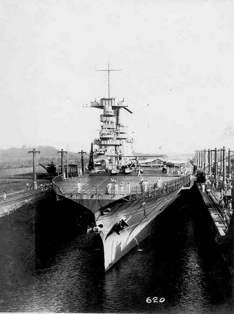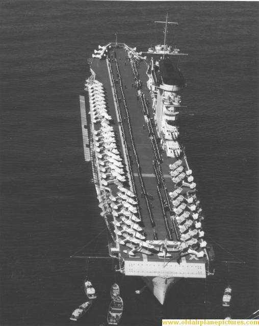 Operations on USS Langley, particularly under the leadership of Kenneth Whiting and Joseph Reeves, had already established the LSO (Landing Signals Officer) and the use of the deck park and crash-barrier as Standard Operating Procedures for USN naval aviation. As well, dive-bombing and its potential had been demonstrated, and now with the arrival of the Lexington and Saratoga those potentials could be realized. Soon, however, a minor problem revealed itself. Once the two carriers had reported to the Pacific, pilots complained that there was no way to distinguish the two ships apart from the air – landing on the wrong carrier was embarrassing and the tradition soon began of deck crews writing graffiti all over the unfortunate aircraft. The final impetus to do something to distinguish the two sisters was the tremendously embarrassing fact that during one of the phases of Fleet Problem IX (more about this below) Lexington was ‘sunk’ by her own torpedo planes (!) which mistook her for the Saratoga which was part of the opposing fleet during the exercise. (26) Deck numbers were not carried at this time and so ‘LEX’ and ‘SARA’ were painted on the ships’ round-down at the stern (picture 21, above)) and a black horizontal band was painted on Lexington’s stack, and a vertical black band was added on the sides of Saratoga’s funnel.(27)(picture 22). Landing on these ships, despite their size, was a challenge. They were completed with the Mk. 1 arrestor gears designed by Carl Norden: longitudinal wires were part of this system (picture 23) but as an experiment they were removed from Saratoga and the accident rate went down. Nevertheless, the Mark 1 had its problems. “If a plane landed off center, it was inclined to go still further off center. In fact, it wanted to go over the side. Any deviation from the center was aggravated as the plane went up the deck.” (28) Alfred ‘Mel’ Pride, who had designed Langley’s arresting system, was brought back and he designed the Mark 2 system which used hydraulics to stop the aircraft and return the gear to its ready position. This was installed in Lexington, 11 August 1931, and became standard in the USN and by 1933 was being used in British carriers as well. (29) The year 1928 saw the two ships sail towards Florida for work-ups, then the Panama Canal was transited and the two ships had time to cruise to Hawaii before the year was over. The next year saw the three carriers (Langley was included) involved in Fleet Problem IX. Saratoga was to attack the Panama Canal and Lexington and Langley were part of ‘Blue Fleet’ defending the Canal Zone. (picture 24) Saratoga was commanded by Rear Admiral Joseph Reeves, the same “Bull” Reeves who had developed the deck park and crash barrier as captain of the Langley. He soon had 90 aircraft operating from Saratoga’s deck instead of the nominal 72-78. (picture 25). On 25 January, 1929, Saratoga detached from ‘Black Fleet’s’ battle line and with only one light cruiser as an escort, made a high-speed dash south and then north-east: at 3:30 a.m. sixty-nine planes began lifting off Saratoga’s deck 140miles (224km)from the Canal. They arrived at dawn to ‘bomb’ the Panama Canal – to the total surprise of the defenders in the Canal Zone and of the defending fleet.(30) Vice-Admiral Pratt, nominally in charge of the attacking force, later stated “Gentlemen, you have witnessed the most brilliantly conceived and most effectively executed naval operation in our history….I believe that when we learn more of the possibilities of the carrier we will come to an acceptance of Admiral Reeve’s plan which provides for a very powerful and mobile force….the nucleus of which is the carrier.”(31) In other words, the carriers should no longer be tied to the Battle Line and Pratt insisted on future exercises exploring the strike potential of the carrier.(32) Further exercises saw successful surprise attacks on Pearl Harbour in 1932 and 1938 and as a sign that thinking had changed regarding the role of the carrier, the Lexington’s had their large 155’(47.4m) fly-wheel catapult, designed for launching seaplanes, removed in 1934.(33) Pictures 26-28 show Lexington in operation during these years while pictures 29 to 33 are of Saratoga.