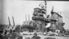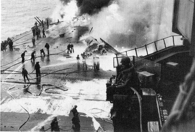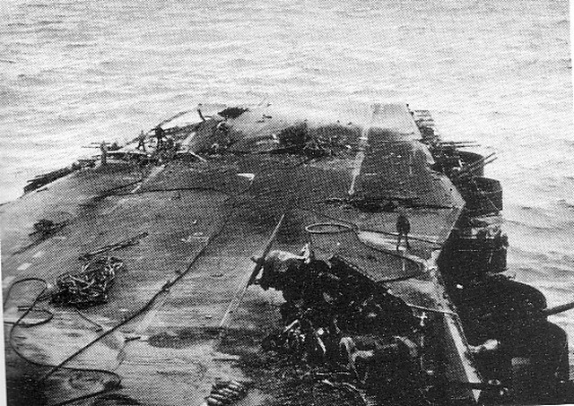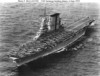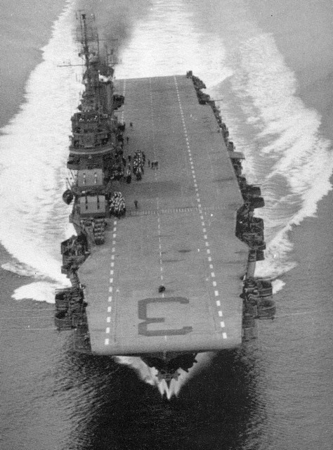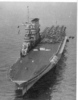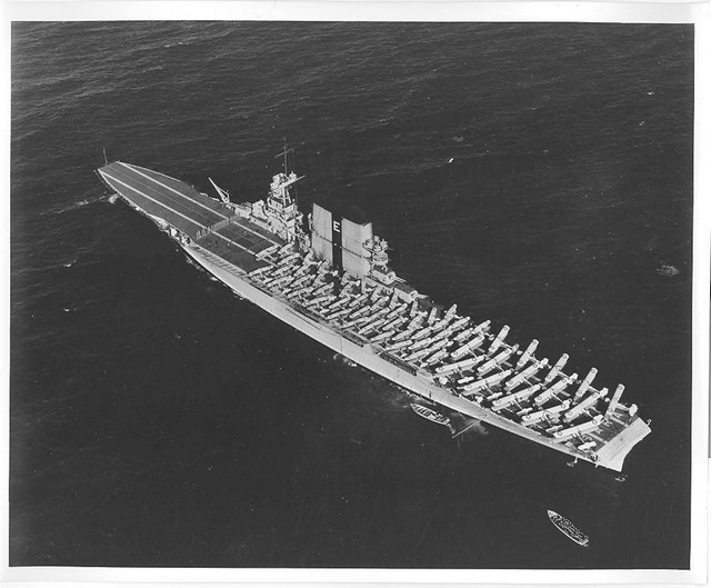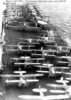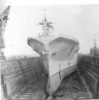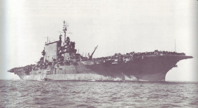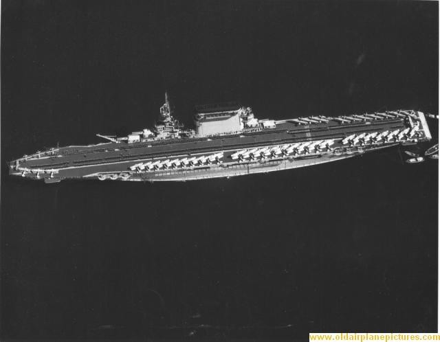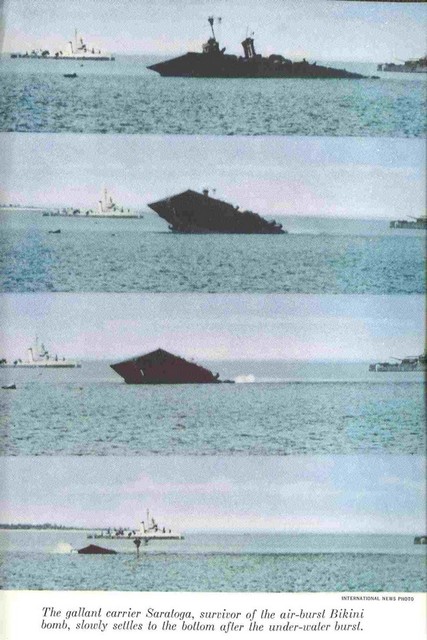 In October, 1940, the USN ‘toned down’ – no more yellow wings; no more mahogany stained flight decks (as seen in picture 34, above); instead, a new drabness as can be seen in picture 35 of Lexington just before the Pearl Harbour attack. Lexington shares with IJN Shoho the distinction of being the first of their country’s aircraft carriers sunk by aircraft from another carrier, the Shoho being lost on 7 May, 1942 and the Lexington on the next day. (34) Torpedoes and bombs from the USS Hornet air wing sank the Shoho, one of the opening acts of the Battle of the Coral Sea. Aircraft from IJN Shokaku and her sister Zuikaku damaged Hornet and sank the Lexington while the American carrier’s aircraft damaged, but did not sink, the Japanese carriers. Lexington received two port-side torpedo hits and two small bomb hits and should have survived, but one of the torpedoes had opened a seam in an avgas tank and hours after the Japanese attackers had departed, severe explosions rocked the ship and she had to be abandoned before nightfall.(35)(picture 36) Saratoga had been in San Diego at the time of the Pearl Harbour attack, arriving in Hawaiian waters one week later. She was soon taken out of action by a single torpedo from the Japanese sub I-6 on 11 January, 1942. She was sent to Bremerton for repairs and modifications and thus missed, again by days, the Battle of Midway. Again Saratoga, this time in the Solomon Islands, took a torpedo from a submarine, I-26. Sent yet again to the yards she exchanged her 8”turrets for the twin 5” turrets found on the Essex class (picture 37); had more anti-aircraft guns added; and had new ‘blisters’ in place to compensate for the additional topside weight. In this modernized condition she fought the war until 21 February, 1945 when she fell victim to a kamizake attack. She was hit by three kamikazes and bombs from three other aircraft and fierce fires raged on the deck for the next hour and a half (picture 38): these were brought under control by excellent damage control work but then another attack wave led to another bomb-laden aircraft hitting the forward flight deck. Again, fires were controlled but the forward flight deck was completely demolished, although aircraft could land aft. (picture 39) Only later was it discovered that the ship had taken another hit, likely in the first wave, by torpedo or bomb, at the waterline amidships, but this caused little damage. (36) Again, Saratoga was taken in hand for repairs and emerged with a new forward elevator in the style of an Essex-class carrier but her rear elevator (which was due for replacement back in 1936) was deleted entirely. (picture 40) With only one elevator operations could not be at the same tempo as previously: in late 1944 she had been designated (along with USS Enterprise) as a ‘night-operations carrier’. Now, after returning to the fleet in May, 1945, she was destined to be a training carrier.(picture 41) When the war ended in August, 1945, Saratoga along with dozens of other ships, provided ‘Magic Carpet’ rides for the tens of thousands of U.S. troops returning home to civilian life (pictures 42 and 43).(37) War-weary and obsolete by 1945 standards, Saratoga was one of more than twenty ships anchored in Bikini Atoll in 1946 for atomic bomb tests. Test Able, an air burst, did very little damage (her huge funnel did collapse) but Test Baker, an underwater blast, did what Japanese submarines and aircraft could not do – sink the Saratoga (picture 44).