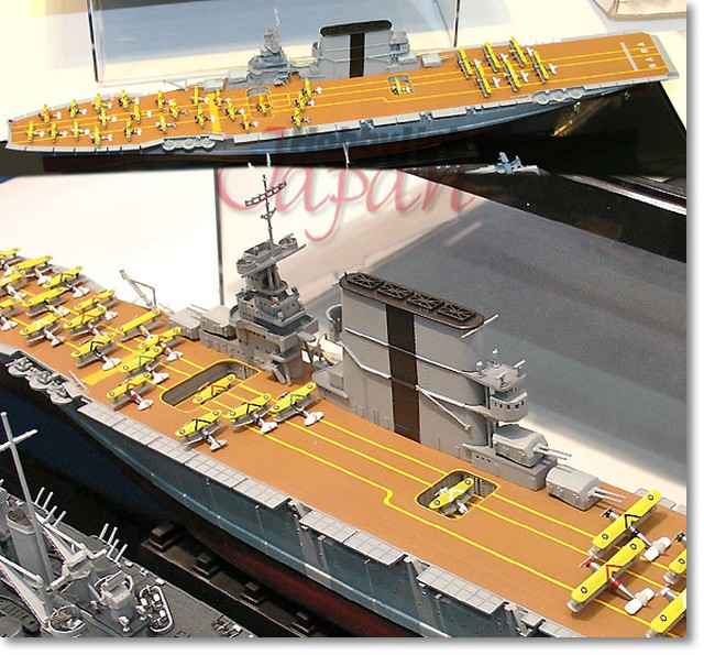For the first time in these articles we come upon subjects that have been modeled in every scale and in every possible medium, including card models. And a reminder: I have no affiliation with any of these companies. Neptun produces in metal a 1:1250 scale Lexington (no.131b) as in 1936 and a Saratoga (no.1317) as in 1944. Superior Models produces in pewter a 1:1200 Lexington (no.A513) as in 1942 and a 1944 Saratoga (no.A514). In 1:700 scale plastic, Fujimi has a Lexington (kit FUJ44116: picture 45, above), and a Saratoga (kit FUJ44117: picture 46). Pit-Road also produces a 1:700 plastic kit of Saratoga as she appeared in 1936 (PITW-96: picture 47); apparently, this kit was produced in co-operation with Trumpeter. A photo-etch of WWII parts can be ordered to fit this kit and other 1:700 offerings, from Gold Medal Models (700-32: picture 48). Trumpeter issued their own 1:700 Lexington (1942: kit 0516: picture 49) and 1:700 Saratoga (1930’s: kit 05738: picture 50). The most exciting news of course, was the arrival of 1:350 plastic kits of these famous carriers. Trumpeter out of China produces a 1:350 Lexington as she was in 1942 (TRPO5608; picture 51) and Gold Medal Models has a photo-etch set for this kit (350-33: picture 52). Their Saratoga kit (TRP05607) sees a 1936 rendering (picture 53) and Gold Metal Models has a dedicated PE set for this kit (350-39: picture 54). I will mention, without creating a listing, that extra aircraft are available in 1:700 and 1:50 scales, and even a set of ship’s crew can be found in PE (rather flat) in these scales and a 1:350 set in resin from L’Arsenal (AC350-25 and AC350-33). Going further up the scale ladder one arrives at card modeling. GPM produces a 1:200 card model of Lexington (GPM-0231 – full hull and 1930’s fit) and a 1:200 of Saratoga (GPM-0223 – full hull; WWII fit) and both kits have accessories available. GoMIx-Fly model also makes a 1:200 card Saratoga (Mix-FLM-081: 1930 fit) with some accessories – but it appears this is a waterline model only (picture 55). Taubman Plans Service (see Loyalhanna Dockyard) has 1:96 plans (7 sets for various parts of the ship) for Lexington (presumably ‘as built’ and so will be accurate for Saratoga as well). From the Maryland Silver Company you can purchase USS Lexington Class (CV-2): A Study in Blueprints (11”x 17” soft cover, 184 pages) and you can use these to scratchbuild a model in whatever scale you wish. (38) From the Floating Drydock, plans and hull lines can be obtained in 1:192 or 1:96 scales: different sets are available for different years, beginning with the Lexington in 1929 and ending with Saratoga in 1945. Finally, on the Steel Navy website, Model Gallery, Aircraft Carriers, if one scrolls down almost to the bottom one comes to the link displaying the ‘Lady Lex’ model donated to the National Museum of Naval Aviation in Pensacola, Florida, by Cdr. Josiah ‘Cy’ Kirby, USNR (Ret.). Next: IJN Akagi and Kaga