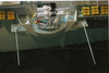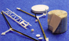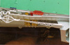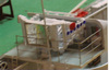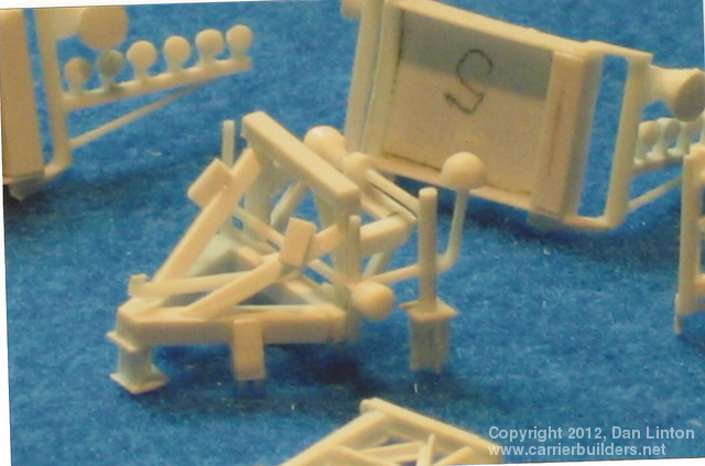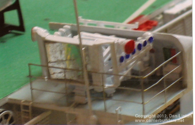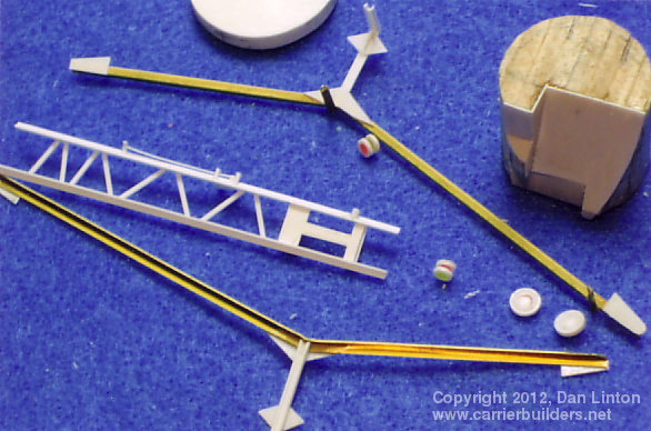 Unlike most carriers, Bonaventure was provided with two landing mirror arrays and the projecting lights associated with these early systems. Pictures 39 and 40, below, show the beginning of construction on the landing mirrors. These were quite complex: rough sea conditions required the entire array to be able to adjust, thus the complexity. This is seen in pictures 41 and 42. The letters `P` and `S` were simply my way of keeping the port and starboard structures separate, although they appeared to be identical. Picture 43 shows the mirror arrays completed, with the starboard array having its arms folded back. Picture 38, above heading this chapter, shows the port side projecting lights in place while picture 44 below shows the starboard lights folded back against the catwalk. Picture 45 shows the starboard mirror, folded, in place and picture 46 shows the port mirror array.