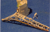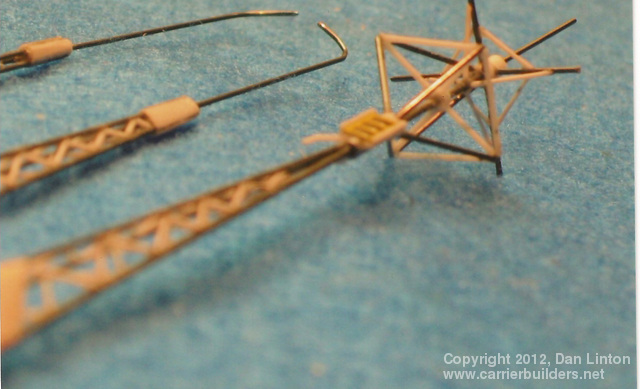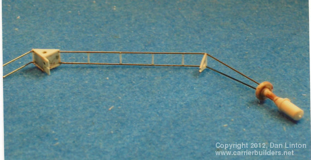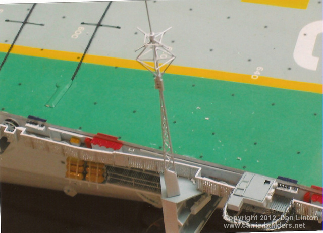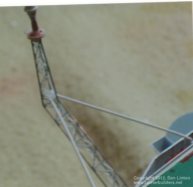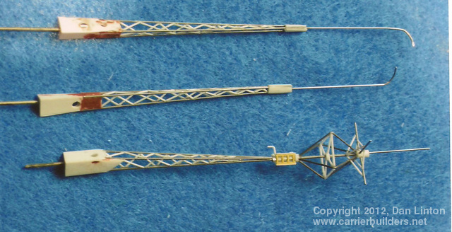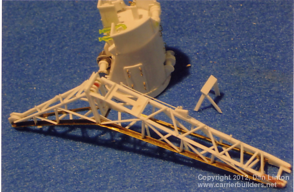 Being originally a British carrier, it is not surprising that some British equipment was maintained on Bonaventure. Picture 47, above, and picture 48, below, show the three large radio masts on the port side under construction. Picture 49 shows the large mast located near the LSO platform. This particular mast could be folded outward but was more regularly stowed alongside the catwalk, as seen in picture 50. The two other masts, seen upright in pictures 51 and 52, could only be folded outward during flight operations (pictures 53 and 54). On the starboard side, forward, was another large electronic mast. Its construction, piano wire and styrene, is seen in pictures 55 and 56. Picture 57 shows it in place. I will have to replace the long styrene pieces which are curving with wire to maintain stiffness. This particular mast is sited so far from the flight deck that it does not have to fold during air operations. However, it must be able to collapse against the hull in order to not interfere with the twin 3``50 cal. guns located on the sponson just to the rear of the mast. How this structure folded, I have no idea.