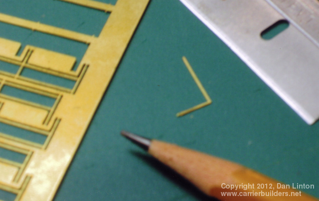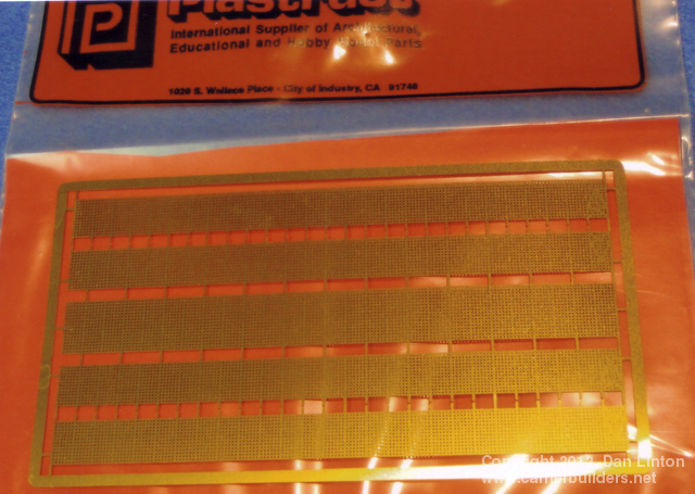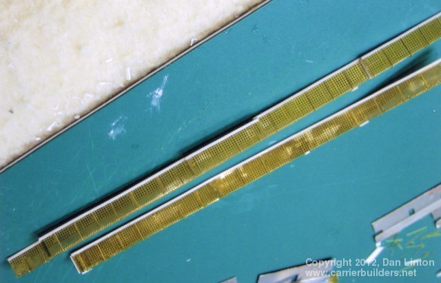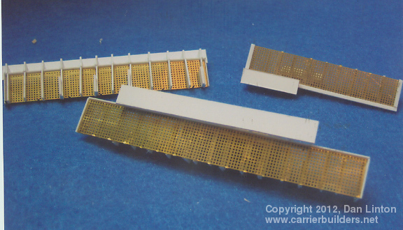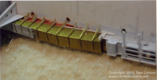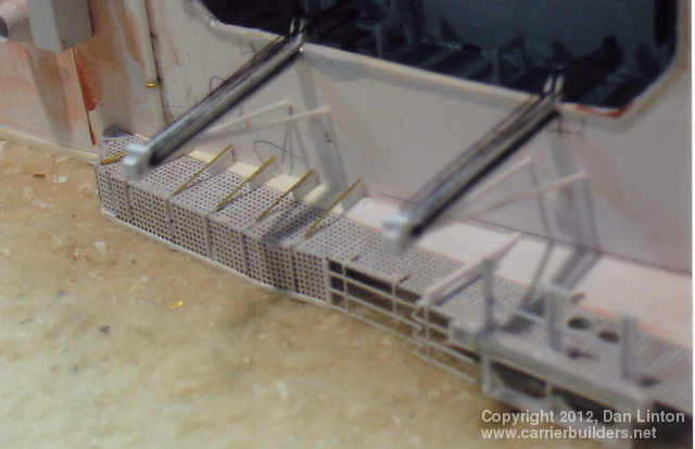 Catwalks (and I don`t know if this term originated with the British or the Americans) have been a feature of every aircraft carrier since the original HMS Argus of 1918. Usually found only on the port and starboard sides of the flight deck, in a few cases – and Bonaventure is one of them – there is a ‘gallery’ or catwalk across the stern of the flight deck. The need to shed water means that catwalks are not solid structures – some pattern of perforations penetrates the ‘floor’ although the sidewalls might be solid. In the case of Bonaventure, the pattern was regularly spaced circular holes on the floor and, no doubt to save weight, on the sidewalls as well. On the model, these were represented by a photo-etch fret, as in picture 6 above (repeated below as picture 7) and picture 8 below. The sidewalls and floors were re-inforced on Bonaventure by welded steel beams – represented here by another photo-etch fret (picture 9). Dozens of these had to be cut out and then glued on using super-glue. Picture 10 shows two catwalks: the white styrene represents the top or handrail portion. This was done using 1/32” ‘L’ shaped styrene superglued to the photo-etch. Picture 11 shows the stern of the flight deck, upside down, just prior to having the ‘gallery’ or catwalk glued on. It is glued on in picture 12, again upside down. Picture 13 shows the completed stern catwalk. It was easier to work these catwalks upside down, particularly when the underhanging support structures were so delicate and complex, as seen in pictures 14 through to 17 below. Picture 18 actually heads the next chapter – it shows a typical catwalk section.