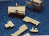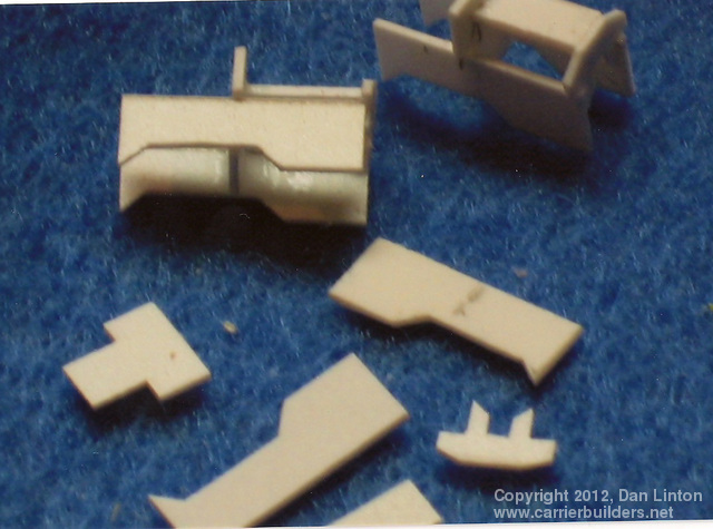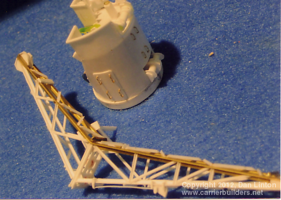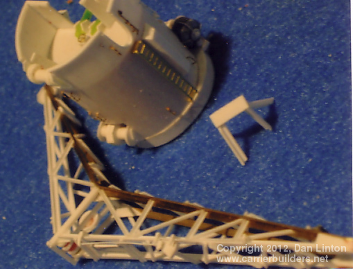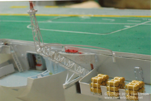 On Bonaventure, the large crane aft of the superstructure had two major functions. At dockside, loading the ship with stores, aircraft, and other heavy items (a load of trucks was once brought to Norway for an exercise involving the Canadian army) which required heavy lifting. At sea, this crane was used to hold up the large fuel hoses when Bonaventure, using underway replenishment, refuelled her escorts or took on fuel or other products from supply ships. Picture 1 (above) shows the major structural parts for the ship’s crane. Note that balsa wood, sheathed in 10/1000 styrene, has been used for the core of the crane support, and a mixture of bras and styrene has been used for the crane arm. Picture 2 shows these pieces from a different angle. Pictures 3 and 4 shows the crane almost completed: the strange looking piece to the right is a bar that supports the crane in its resting position. It will be glued directly to the flight deck. Picture 5 shows the completed crane in its position aft of the superstructure.