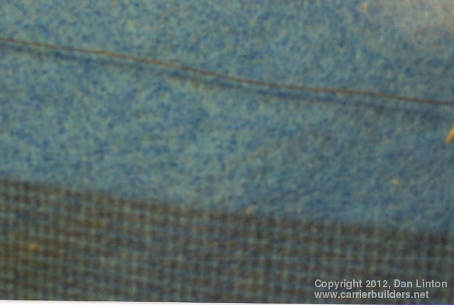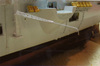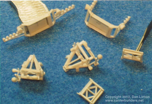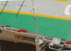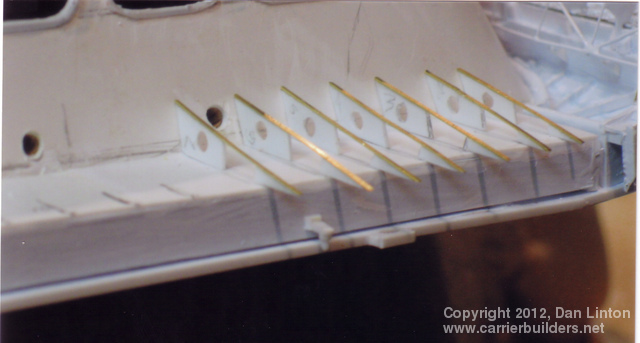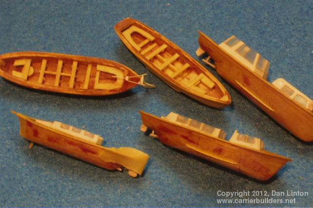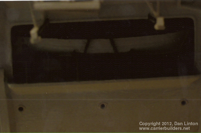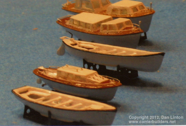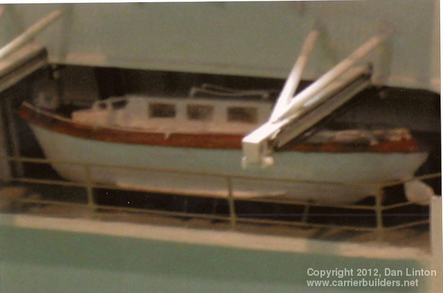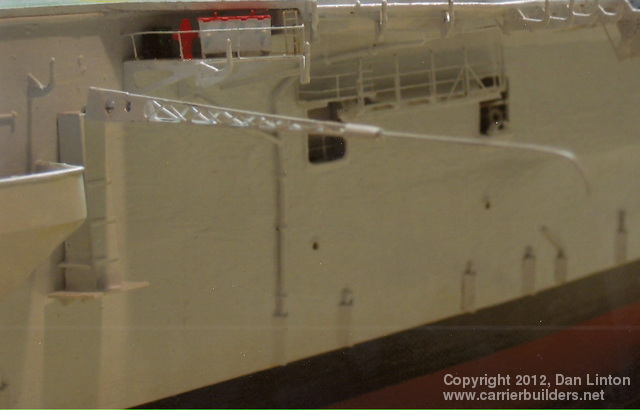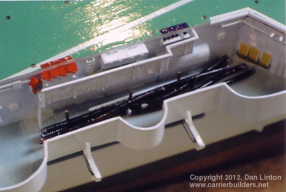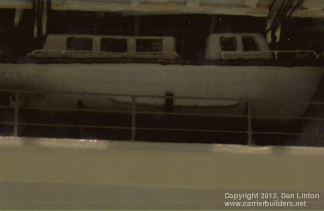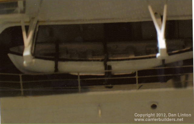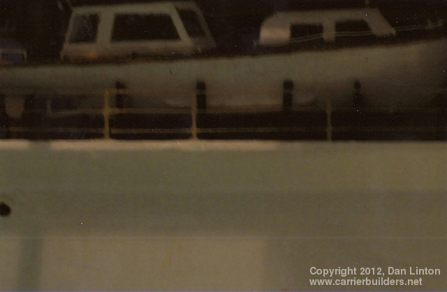 Bonaventure had eight whip aerials or antennas on its island and most can be seen in picture 58, above, particularly the three attached to the smokestack and painted black. Around the flight deck were another dozen. Each gun sponson had two platforms, one on each side, which carried a whip aerial. These were upright (picture 59, below) except during flight operations when they would be folded outward (picture 60). This pattern was also true of the aerials aft of the starboard rear gun sponson (pictures 61 and 62). The aerial directly in front of the starboard mirror array (picture 63) could also be folded outward or parallel to the flight deck (picture 64). The smallest aerial was found on a platform just outside of the crane (picture 65). Its position would not affect flight operations but its location near the crane would interfere with underway replenishment, thus it folded parallel to the flight deck. Picture 66 shows hoses, used for underway replenishment, stacked inside a sponson. Ship`s Boats: From commissioning in 1957 to its 1966-67 refit, Bonaventure had five boats, stored in deep insets in the hull. Significantly, four of these boats were eliminated and the ship emerged after its refit with only one boat and four of the insets plated over. The boats were not considered useful and they suffered much water damage in their exposed positions, particularly on North Atlantic operations. I had the choice of building the boats with covers (the easier choice) but because of decent plans (picture 67) I decided not to cover them up. Pictures 68 and 69 show the boats under construction. The next five pictures (and I apologize for their being dark), 70-74 show each of these boats in place. [note: because each chapter only allows for 12 pictures, there was not enough space for pictures 71-74: they are found at the end of the article, along with the pictures in chapter 10).