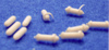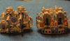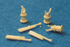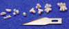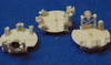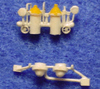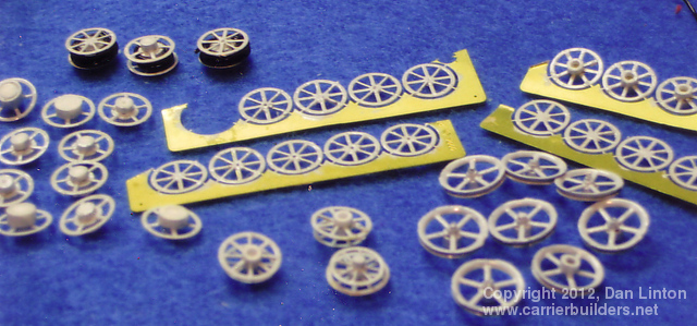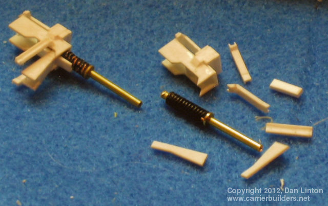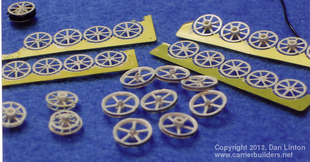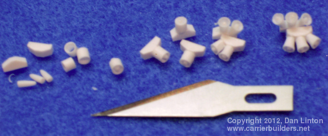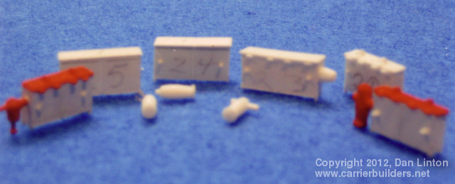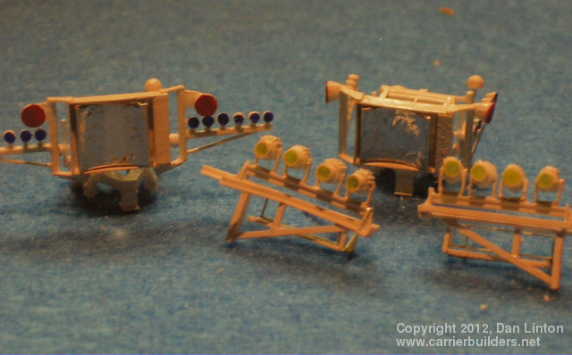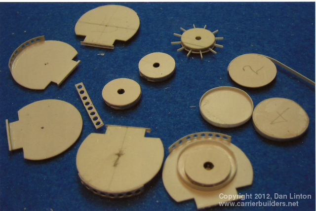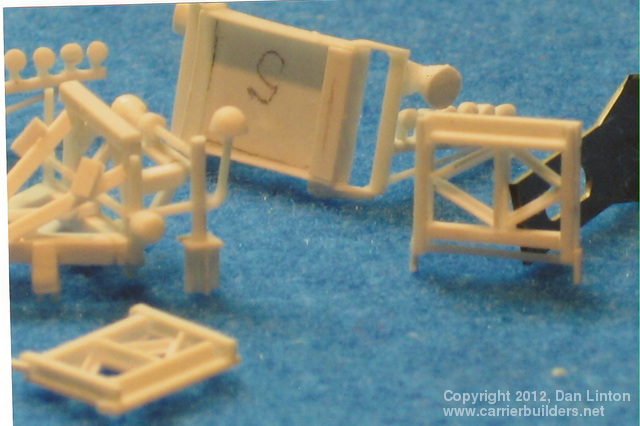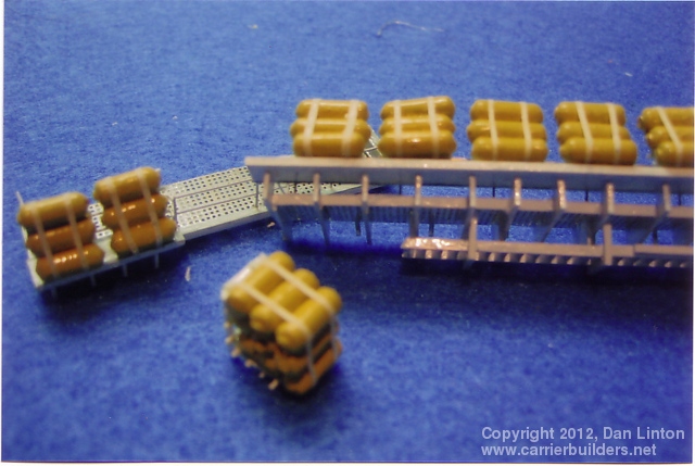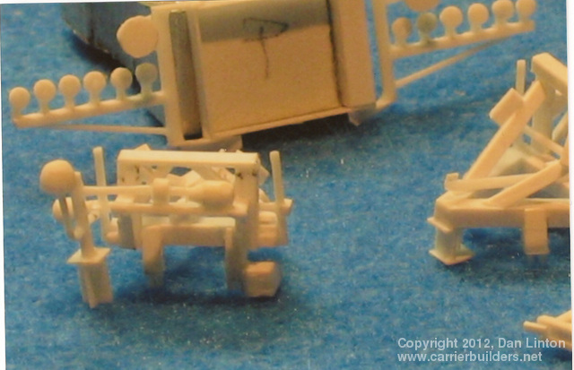 Bonaventure had literally hundreds of hoses and dozens of hose reels. In picture 18 above, four of these reels can be seen, two with hoses on them (black wire was used) and two bare. These reels came from photo-etch frets, usually of an assortment of hand-brakes, used by railway modelers. In picture 19 below the handbrakes with four spokes on the bottom row will be modified to produce reels with eight spokes, as seen along the top row. Each reel required two handbrakes; sometimes the rear one had eight spokes and the one in front was smaller with only five spokes, as seen in picture 20. Picture 21 simply reinforces how many of these had to be made. The picture at the head of this paragraph shows a pair of yellow-topped structures with two large hose reels to each side. These were condensers, in pairs, and four pairs were found on Bonaventure, one pair in each quadrant. Picture 22 shows a pair: once finally assembled cuts had to be made as part of the structure was below the level of the catwalk. These condensers began as lengths of styrene road, cut and shaped, and then other pieces were added (picture 23). Picture 24 shows some ‘fireboxes’. Inside these boxes with red-painted lids were fire hoses, connected in times of emergency to the pumps, here painted in red, associated with each box. There were almost two dozen of these on Bonaventure found in the catwalks, and two were beside the island facing the flight deck. Picture 25 shows the beginning stages in creating the life raft `bags` and their support structures. Platforms for some of these life rafts are seen in picture 26 and in picture 27 some have the `bags` attached. Notice in the foreground of this picture a grouping of nine bags. Three of these groupings (thus 27 `bags`) were located on the foreward large sponson on the starboard side (picture 28). Other locations were port side aft (picture 29) and starboard side aft (picture 30).