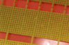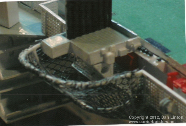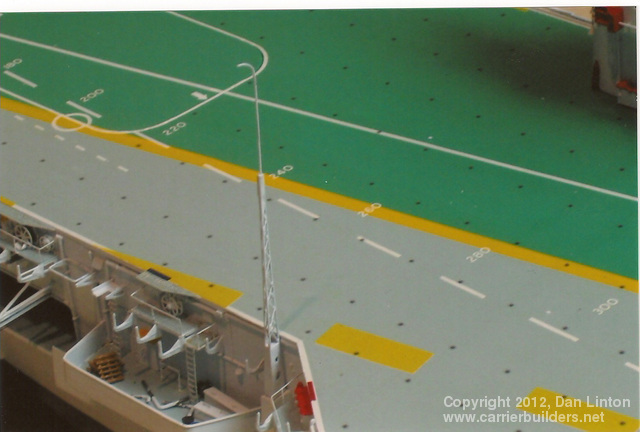 The flight deck of an aircraft carrier is a very dangerous place and all carriers have safety nets in those areas where catwalks are absent. Picture 31 above shows a strange feature of Bonaventure. A long catwalk is visible but it does not have an outside wall: instead, there is a flimsy-looking handrail and outside of that a safety net (but in this picture only the support bars are visible as the net had not yet been glued on). The netting on the Bonaventure was difficult to model. On most carriers the netting (which is rope) is stretched almost flat, having only a modest sag. On Bonaventure the nets sagged to almost a `U` shape and the edges seem to have had extra rope and thus appeared thicker. So, to try to model this I cut out strands from a sheet of plastic screen (picture 32) and then glued them to the support bars (picture 33). Picture 34 shows the area around the LSO platform: the netting comes from the type of delicate mesh used to wrap wedding candy. This was darkened with a magic marker, cut, and then glued into place. On modern American carriers deck crew wear helmets with built-in radio receivers, so the need for loudspeakers is not as important as in earlier times – but loudspeakers are still found on Nimitz-class carriers along the catwalks and on both sides of the superstructure. Bonaventure had fifteen sets of loudspeakers, two of which were on the island facing the flight deck. Pictures 35 and 36 shows the construction sequence and picture 37 shows one of the speaker sets in place along the flight deck.