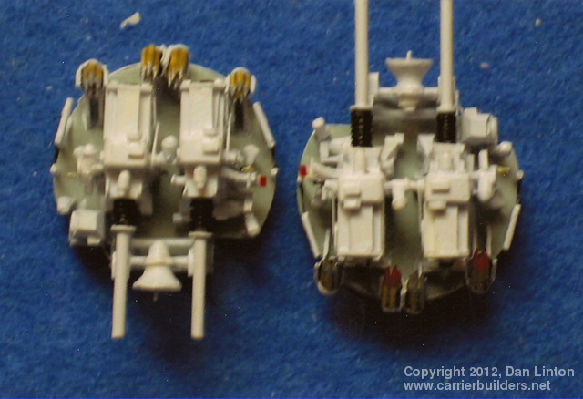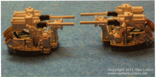 Bonaventure had four twin 3”50cal. guns, each being supported by a sponson located on each of the four quadrants. Far too light for major surface action, they were also inadequate as anti-aircraft guns for combat in the 1950’s and 1960’s. Canadian admirals wanted them replaced by surface to air missiles but these were expensive. The 1966-67 refit simply removed the foreward guns and their sponsons; the aft guns were retained. Since the guns were open mounts and quite complex (see picture 75 above and 76 below), they were the last major structures I built for this model. The platforms for the guns were the starting points. Picture 77 shows platforms in the foreground with their undersides completed. You may notice five platforms in the picture – the extra is for another modeling project. Picture 78 shows three platforms ready to receive their gun mounts. The beginning of these mounts is shown in pictures 79 and 80. The mounts were not identical: picture 81 shows the right-hand mount and picture 82 the left hand mount. Picture 83 shows progress with two platforms having their gun mounts in place. Pictures 84, 85, and 86 show completed assemblies, with handrails, seats, and shells in place. Each of these twin 3”50 cal. guns and mounts has over 280 pieces. They took a long time to complete. The last picture, 87, shows a completed twin sited on its sponson.