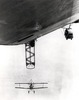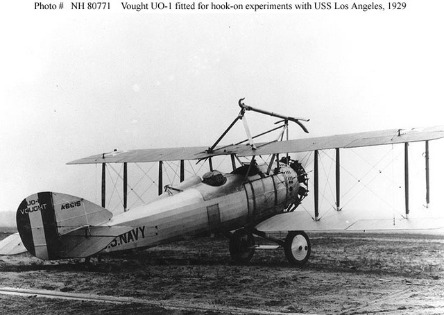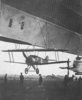 This airship was built at the Zeppelin factory in Germany (company designation LZ-126) as part of war reparations (picture 20, above). It was delivered across the Atlantic (only the fourth craft ever to do this by air) by its German crew in October, 1924 (picture 21) and commissioned as the USS Los Angeles, ZR-3, on November 25, 1924 at Lakehurst, New Jersey.(picture 22) Protests from the British government had forced a compromise: LZ-126 was built as a non-military vehicle and was outfitted with a cabin with very high standards for airline travel and its prospective operator, the United States Navy, had to agree that it would be used only as a training vessel. Once in America, commissioning had to await the arrival of the Shenandoah to Lakehurst for removal of its helium into LZ-126, as there was not enough helium in the entire country to fill two airships at the same time. By early in 1925 the supply problem of helium was resolved but it was always an expensive commodity. (10) In terms of size, at 656’ x 90’ (202m x 27.6m) it was roughly the same as Shenandoah but with a thicker finesse ratio and it was to lead a charmed life and was the only U.S. Navy airship of the inter-war period to be retired rather than destroyed. Altogether it travelled 172,000 nautical miles (about 300,000km), taking part in exercises and important experiments. (11) But it was the events of August 25, 1927 that brought this airship directly into the public eye. The Los Angeles had just been tied off to its mooring mast at Lakehurst, New Jersey, when a sudden gust of wind lifted its tail. A warm, low-pressure layer sat on top of a cooler layer, thus the tail kept rising and no actions taken by the crew could stop it. Soon Los Angeles was standing on its mooring mast at an 85º angle as seen in Picture 23. This picture made its way around the world and gave contrary impressions – first, how vulnerable any LTA craft was to the elements; and second, how tough the Los Angeles had to be to have coped with the stresses involved as it quickly stood on its head, and slowly returned to the horizontal as the air masses mixed and the pressures equalized. Los Angeles is seen in Picture 24 on the deck of the new USS Saratoga CV-3 in January 1928. An interesting demonstration, perhaps, but no one had yet worked out how the two systems, carrier and airship, might work effectively together. Perhaps the most important experiments undertaken by Los Angeles involved the concept of ‘parasite fighters’ – aircraft that the airship could carry along to provide reconnaissance and air defense. The ‘proof of concept’ tests were necessary since the two large airships that would follow Los Angeles were being designed to carry as many as five fighters each. The idea of carrying aircraft aloft had been tried by the Germans late in WWI: some Zeppelins could carry an aircraft and release it, but they had no way of recovering the aircraft so the idea was not carried further. The British, despite their airships being very inferior to anything the Germans had, also tried out this idea. Picture 25 shows a Sopwith Camel under airship R.23 on Nov.6, 1918 and Picture 26 shows R.33 with Gloster Glebes underslung in 1926. None of these experiments appear to have involved recovery of the aircraft by the airship. The U.S. Army, however, had a modest airship program in place after WWI and had undertaken experiments in the recovery of aircraft by an airship. Pictures 27 and 28 show Army blimp TC-7 and a modified Sperry Messenger aircraft: the aircraft made a successful ‘link-up’ or ‘capture’ of the aircraft by the blimp in December, 1924. Despite this success, the U.S. Army abandoned the program and it was left to the Navy to develop it further. USS Los Angeles was fitted with a ‘trapeze’ that could swing down from the belly of the dirigible and an aircraft with a special hook would latch onto it. (Picture 29) The aircraft first used was a Vought UO-1, a utility aircraft (Picture 30) and many successful hook-ups were made (Picture 31) in 1929 and early 1930. The Los Angeles would go on to participate in Fleet Problem XII (1931) and Fleet Problem XIII (1932) but the judgment rendered on her activities was that they ‘demonstrated no particular benefit to the fleet’. (13) This is not the message that Moffett and BuAer wanted to hear. They had sold the U.S. Congress on the idea of ‘aircraft carriers in the sky’ and soon those airships would have to deliver on the promises made. Meanwhile, by the end of 1932 Los Angeles was decommissioned: a suggestion to re-use her arose in 1934 to test how well minimally-prepared sites might be able to handle airships, as opposed to creating numerous, expensive, mooring masts and facilities, but little came of this and she was finally stricken from Navy strength and in October,1939, she was scrapped. (14) But she had served very well during her years of service.
