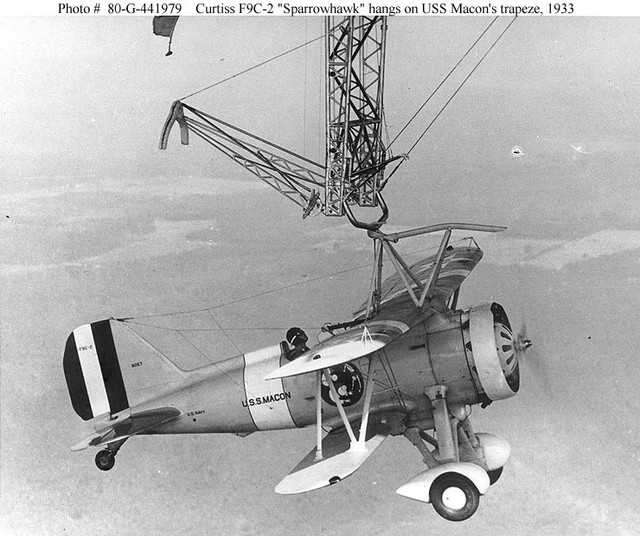 USS Akron: Lost before its Promise Delivered Akron’s scouting performance in the 1932 Fleet exercises was rated as ‘poor’ but none of her aircraft were aboard at the time nor her pilots honed in launching and recovering from the airship. As a scout, Akron had found the ’enemy’ fleet but the cruisers in that fleet sent up floatplanes to attack. Akron was destroyed ‘several times’ despite the presence of 7 machine guns on the airship. In part, the poor performance was a function of how she was ‘role-played’ when the exercise was set up. Unresolved in 1932 was the issue of whether the airship was to be the main scout, going in harm’s way to find the enemy and using its aircraft for defense and escape only – a view shared by most of the airship’s officers—or having the airship as a passive base far from harm’s way and having her aircraft do the actual scouting – a view shared by the pilots. (22) In July, Curtiss F9C Sparrowhawks were assigned to the Akron. Only eight of these special aircraft were built, two the F9C-1 model and the rest the -2. (23) Serious testing now began. Pictures 40(above) 41, and 42 show aircraft involved in launching and recovering from Akron. The pilots were not entirely happy with the Sparrowhawk, particularly with its range but a look at picture 43, showing the inside of Akron’s hangar, shows why the aircraft had to be so small. It is doubtful that such a small airframe, only 20’ long with a 25’ wingspan, would have been able to accept the weight of a wing-folding mechanism. Empty, the little plane weighed only 622 lbs.(283kilos). Much training occurred in late 1932 and into early 1933 and it might have been Akron’s role to reverse the ‘poor’ rating imposed in the 1932 exercises but that was not to be. Akron had had some minor accidents in its short career (Picture 44) and often required maintenance when its performance envelope was challenged by severe weather but on April 4, only a few short weeks after its sister ship Macon (ZRS-5) was christened (24), Akron on a training mission on the East Coast was lost in a severe storm. No one apparently had thought to provide life-rafts or life-jackets aboard a Navy ship (!), thus there were only three survivors of the 76 men on board. One of the men on board, as an observer and an officer who visited airships as often as possible, was Rear Admiral William Moffett, the ‘father of naval aviation’ and the head of BuAer. His loss would deeply impact not only the airship program but also other projects that he favoured. (25)