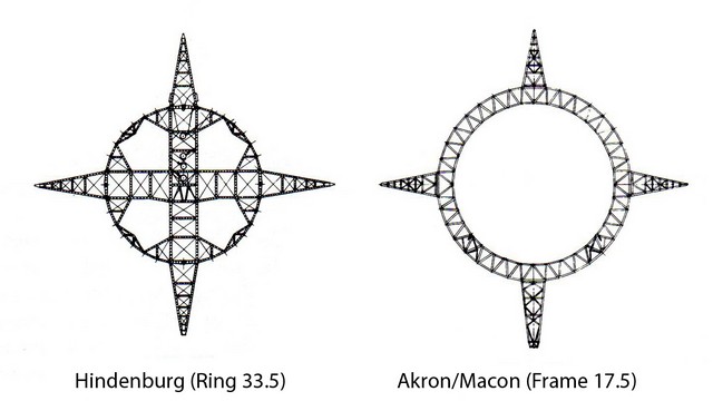 The loss of USS Macon was caused as much by politics as by any other cause for the repairs that might have saved her were never completed. The Akron and Macon had novel design features that gave the airships great strength: primary among these was the triple keel design (29) (Picture 54, above). Arnstein had created a strong but light design (Picture 55) but there was a potential weak area. Unlike other Zeppelins, the tail fin structures did not carry through the body of the airship but were attached to heavy rings in the interior (Picture 56). As well, since the Navy insisted on a clear view of the bottom fin from the forward gondola, and since this fin was prone to ground strikes during handling, it was made smaller. Picture 57 shows that the fins were only attached to two strength rings, instead of three as in the original design. Where the fin meets the body of the airship is where the stress is the greatest but here the attachment is made to an ordinary stringer rather than a strength ring. In 1934 two beams near the fin had snapped and temporary emergency repairs were made. Arnstein, as Chief Engineer, was ordered to strength in area of the fins in stages during normal maintenance periods. He wanted to ground the airship and make all the repairs at once but was refused. In July, Wiley and the Macon find the President but Arnstein sends a warning to the Aviation Safety Council warning that there should be no fast manoeuvres during stormy weather. (30) The repairs proceed but are never completed: strengthening of the top fin will take place during the next scheduled maintenance period in early March. But in February, 1935, Macon is tasked to scout and find the opposing fleet: at 5:00 PM on February 12, the exercise completed, Macon is over Monterey Bay heading north. But to the north is a storm front and the Macon could not get around it: a strong gust then ripped off her upper fin, the only one not yet reinforced, and more damage began to occur. Three cells were lost yet the airship kept rising until finally it reached its pressure ceiling where gas would be vented automatically (otherwise the gas in the cells would expand in the lower air pressure until they burst), then it began to slowly settle down and was torn apart by wave action outside Monterey Bay. This time, however, with life jackets and rafts aboard, only two of the 83 crew members are lost. (31) An investigation was held and a commission appointed at the request of the President. The commission recommended that the Navy not give up on rigid-frame LTA but the recommendation was never followed up with action or funds. The airship program was dead and events such as the Hindenburg disaster in 1937 only served to prevent it from ever rising again. The beauty of the great ships (Picture 58) seen by tens of thousands as they glided majestically over cities masked the great vulnerability of these vessels to the weather but inspired many a dream and many a speculation. One of the more interesting ideas has an airship base in Hawaii by 1941 and a scouting patrol by parasite fighters from an airship on a routine patrol spots a large group of Japanese naval vessels headed by six aircraft carriers. We know that the Japanese were under orders not to initiate an attack if they were spotted before they arrived in Hawaiian waters – discovered by a ‘flying aircraft carrier’s planes? Certainly this is a good opening plot line for writers and fans of ‘alternate history’. (32)