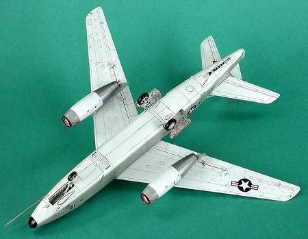 The model was painted entirely with Testor Model Master (enamel) in Flat White, and Light Gull Gray. First job up was painting the “hot” section of the engines with SNJ Aluminum, letting it dry overnight, and then masked with Tamiya Masking Tape. After airbrushing the entire model Flat White, I stuffed wet tissue paper into the wheel wells, masked off the white control surfaces with Tamiya Masking Tape and airbrushed the wings and fuselage with Light Gull Gray. A light topcoat of Floquil Railroad (enamel) Crystal-Cote was airbrushed to prepare the flat surface for decaling.