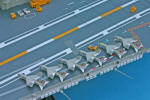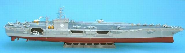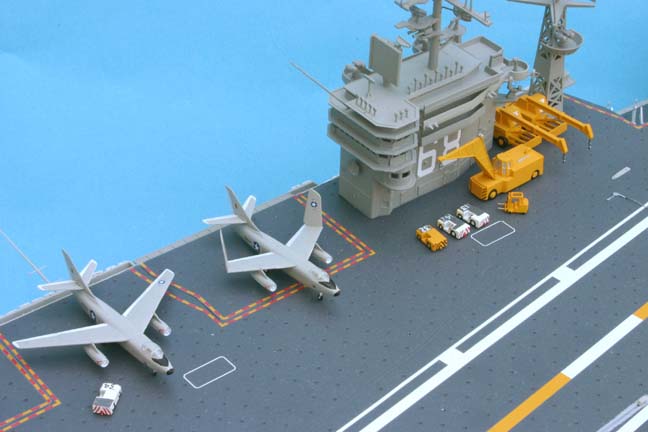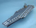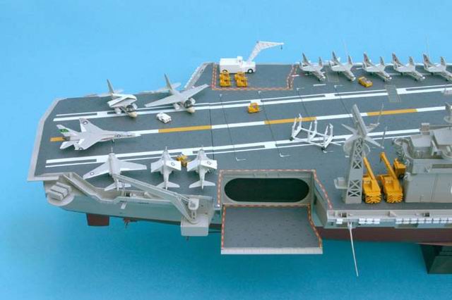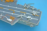 On deck, the ship is depicted as it was in 1975 when the aircraft were launched with cat strops and as such she has the three extensions to the ends of the launch rails which are not there today, decals are supplied for the deck markings but not all of them are used at one time, your research will show which are needed, even the 68 bow number was painted differently at various time so be aware.