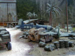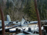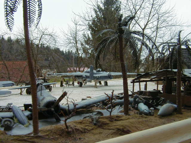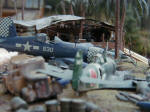 The original diorama had a somewhat other layout, but about 6 years ago it was extensively damaged in an accident and at the end I had no other choice then to rebuild the whole Diorama again. In this layout the Corsair was standing beside the Hellcat but it received heavy damage in the accident and the landing gear was truly destroyed, so it went directly to the scrap yard, together with the Japanese Fighter which was already there. Due to that I had to build another Aircraft and my choice was a Navy B-25 (PBJ-1D). This time I was able to buy some aftermarket parts and modify this aircraft somewhat easier, than the Hellcat. New engines from Aires and some PE parts from Eduard were used to detail the Mitchell. Nevertheless I wanted to show some heavy damage to the wing, so I had to build the entire wing structure of the port wing. This was done by using small plastic stripes which were cut to the desired length and shape and glued together. I used some slightly thicker Aluminium foil to copy the original wing by simply wrapping it around the removed wing section. After that the this hollow aluminium structure was simply slipped over the inner structure. The aluminium was then “damaged” to show the inner structure. Sounds not only pretty simple it was that way, only a lot of work. The large workshop was entirely scratch built, all those tiny tools and parts inside came from various kits and some of them like the workbenches were scratch built too. Same is for the scrap yard, where leftover parts from kits were used as well.