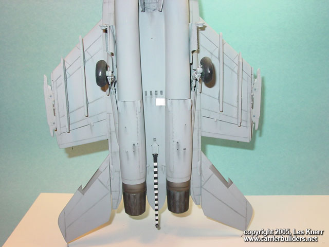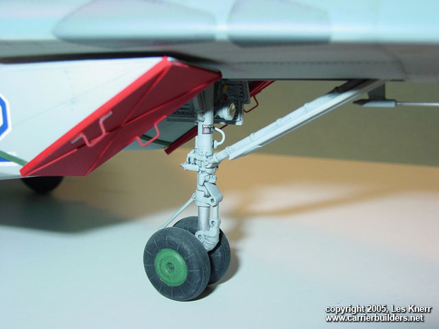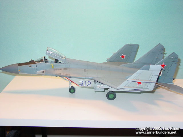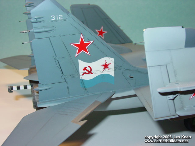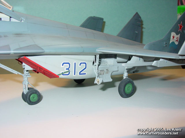 The decals - side numbers and red stars are from a Microscale 1/32 scale MiG-21 sheet. The Soviet Naval Ensign on the vert stabs were painted on using Friskit stencils for the flag and the hammer and sickle. The red stars are decals. As far as the green color on the wheels - a friend of mine gave me a bottle of "home brew" paint simply marked "Soviet Wheel Green." And silly me never asked where or how he got it.