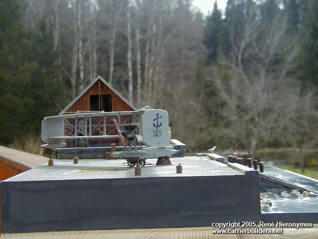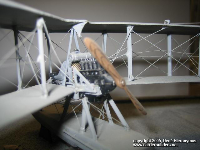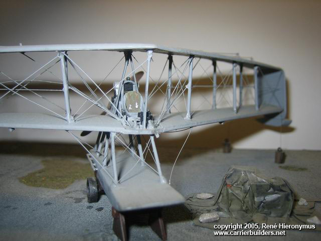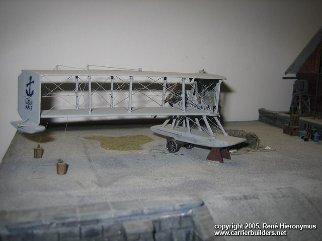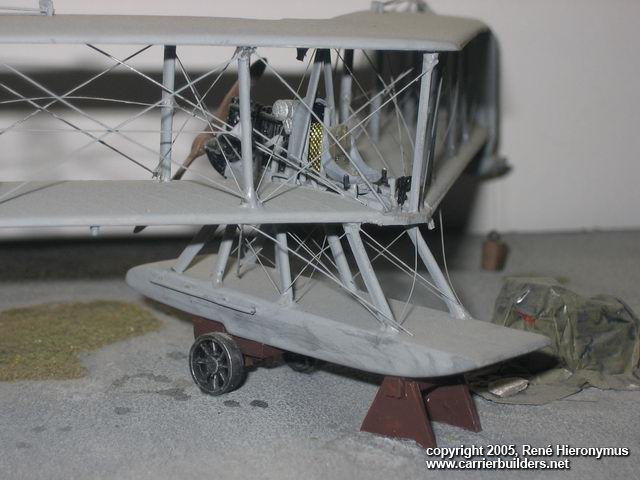 In the kit was something included which (with quite a lot of imagination) should have been a radial engine. I replaced this with a small inline engine from Aeroclub as well as the propeller. The kit version was supposed to be a twin seater with some kind of fairing for the pilot and the observer as well as that “should be radial engine” In my case I decided to build the much more interesting version with only a single pilot and no “fuselage” at all. That way I had to build the entire “cockpit” scratch with a small seat, steering column, rudder pedals and some small wheels for trimming. Off course because there is no fuselage at all, all the control wires for those rudders had to be build as well. The rest was pretty easy, the centre float was build of plastic sheet as well as the two smaller floats under the rudders. Some small details like the water-cooler and the gasoline tank were added, all scratch build off course. At the end the only thing left was the rigging. This “only thing” was some kind of nightmare and the model-aircraft was more than once close to fly right out of my closed window. But I kept my patience and at the end I was able to colour the whole “thing” The early kind of markings were “handmade” with a very small brush. After that I decided to give this little bird some kind of background in form of a small diorama. The little house was made entirely scratch, complete with the roof and some miscellaneous parts around it. The water is a 2-component transparent resin. The stone walls are made from plaster and at the end I put a single figure from Airfix on the Diorama.