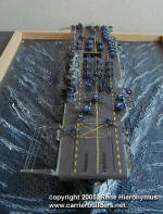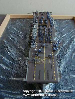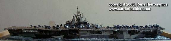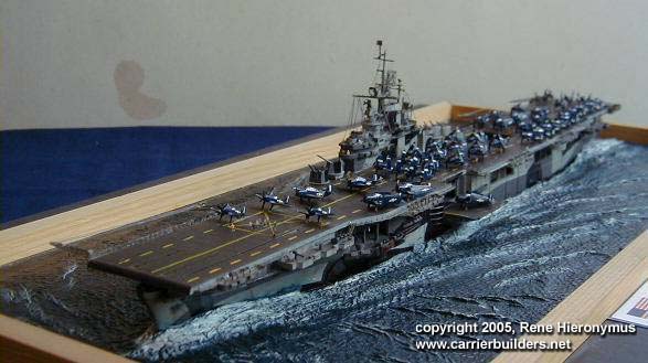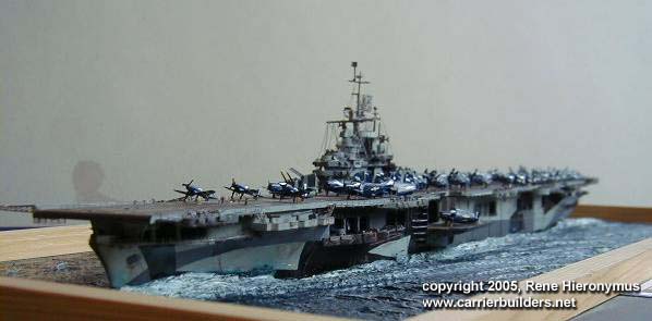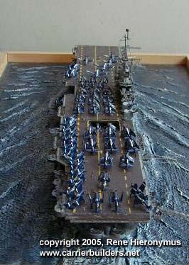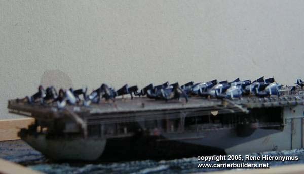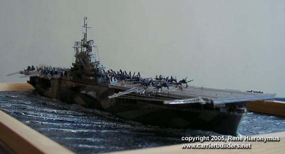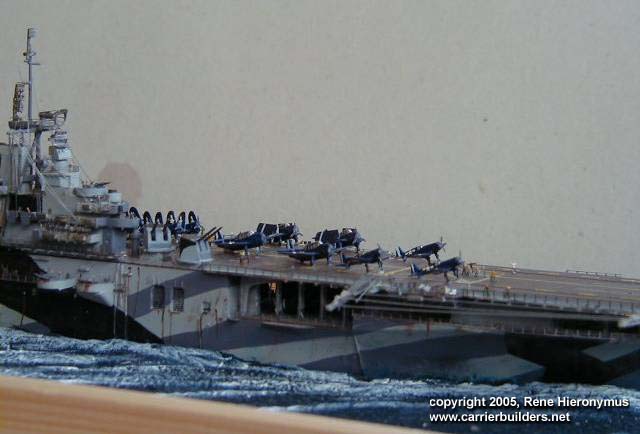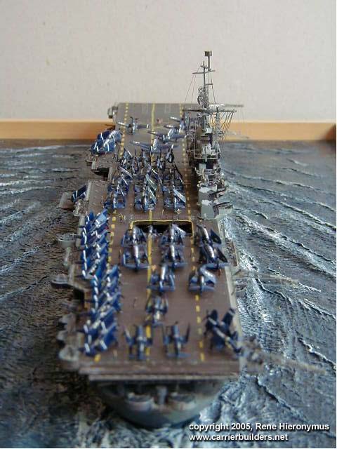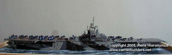 Normally I only build in the scale of 1:72. But it always had been a dream of mine to build an aircraft carrier in this scale. So when I was at the planning stage for such a project and when it became clear for me that I would like to build the Intrepid ,one of my first ideas was to build what I called a “reference model”. This was simply that I wanted to know what I was starting to build and to have some kind of description for the end result. So I found a Essex Class Carrier model in the scale of 1:700, which should have been the USS Essex CV-9. I do not know exactly but I believe this model is from Fujimi. Nevertheless I converted it into the Intrepid, by rebuilding the entire Island and most of the catwalks with all that armament. Even to the fact that all Essex Class