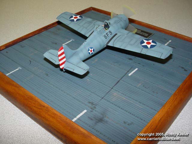 The base is the 1:72 scale Yorktown class kit from Flattops & More Hobbies. This depicts the early Enterprise with the cross deck tie downs on four-foot centers. The kit includes an 8” x 8” x ˝” wood base, and photo etch tie downs. For additional information check out www.flattopsandmore.com or contact me at rusty@flattopsandmore.com