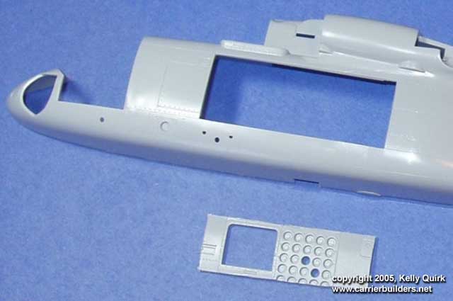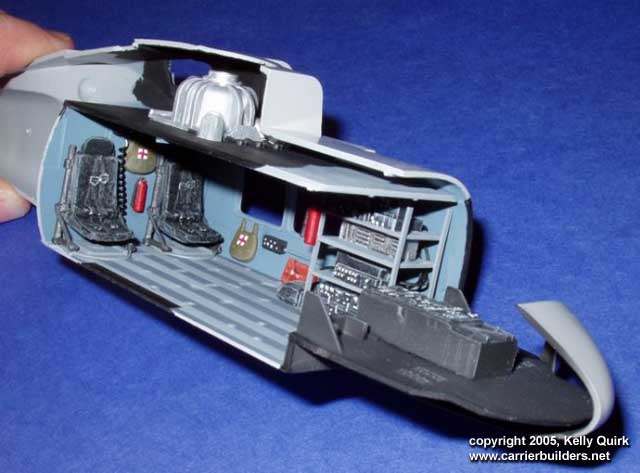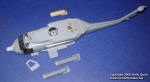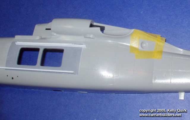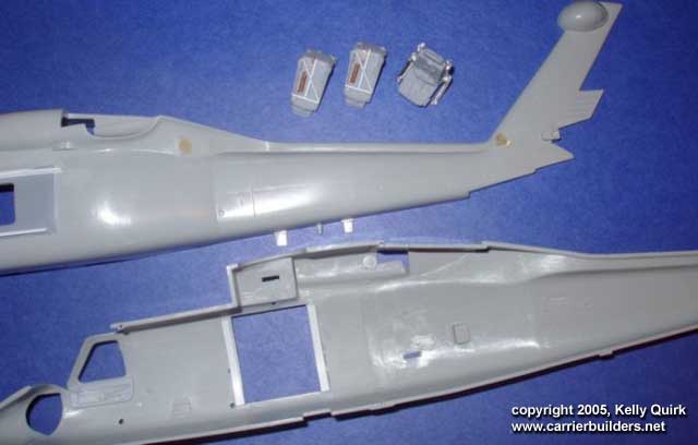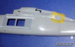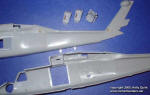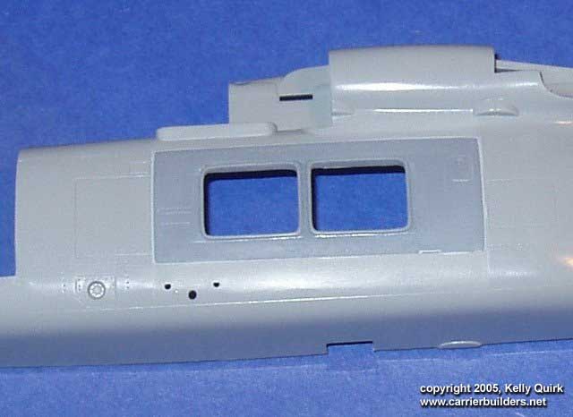 The biggest part of the conversion requires you to cut out the port side window and sonobouy launcher from the kit. You just cut along the scribed lines on the inside of the fuselage. Then you add the window plug that Cobra Co. provides. There is an exhaust port of some sort on the SH-60's on the port side (right below the main exhaust) that the Jayhawk does not have, so I filled it in with resin and sanded it smooth. Other conversion parts are a full interior, complete with equipment rack, seats, cockpit consoles, doors, etc. I added a few more detail items like First Aid bags, COM cables, control boxes and grab handles. The rest of the conversion parts give you drop tanks, pylons, nose radar assembly, tires, and strip styrene to construct the window rails and drip shield. I added some detail to the back of the resin seats. The Eduard PE set for the SH-60 was not available at the time of this build, but I did have some spare H-60 frets laying around and utilized some parts from those to help dress up the kit. I. had a spare FLIR pod in my parts box, and I have seen the Jayhawk equipped with these, so I added that to my model. Landing lights were replaced with MV lenses.