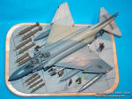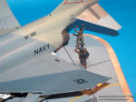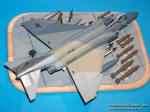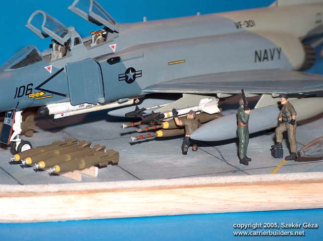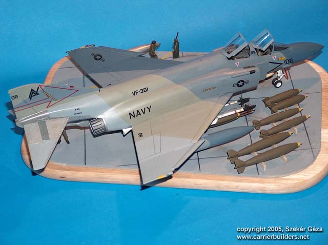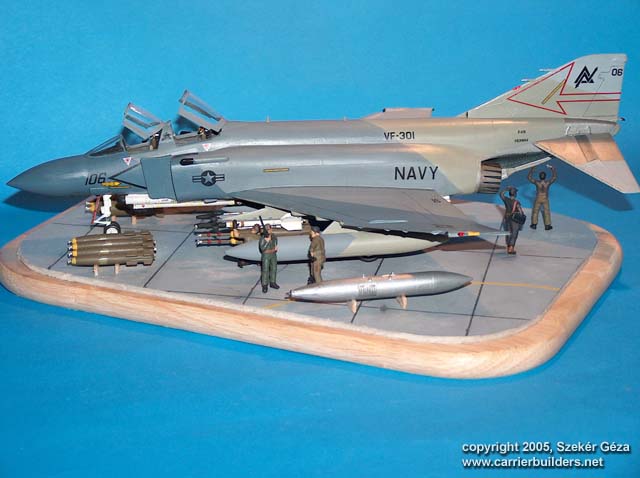 In 1984 VF-301 Devil's Disciples F-4S Phantoms were replaced by the F-14A Tomcats. This diorama depicts a theoretical situation where the last of these Phantom are being loaded with ordnance to the last show. This plane wears the Ferris paint scheme, it was handbrushed. I added some scratch details to the cockpit. The diorama base is a wooden cheese chopping board, the tarmac is made of cardboard. Figures are from the Italeri set, ordnance is from the Hasegawa weapons set. web: http://gcart.uw.hu