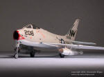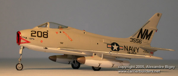 I love the beautiful and aggressive lines of the last of F-86 Sabre naval derivatives, designed as a low altitude attack aircraft and first flown December 4, 1956. Its entirely new wing and weapons systems enabled it to carry up to 6000 lbs of underwing load, including nuclear weapons. Before retiring in 1962, being progressively replaced by Douglas’s “scooter”, the A-4 Skyhawk, it served in 9 navy squadrons and 3 USMC squadrons. Emhar produced a 1/72 injected kit with raised panel lines, also reboxed by Revell. The great pity is that no manufacturer have been able so far to reproduce correctly the subtle nose shape of this bird, and in any scale, so, much filling and sanding is essential in order to get closer to reality. The NAVAL FIGHTERS FJ-4/FJ-4B book by Steve Ginter is a must as reference material. Despite some purist-hair-rising inaccuracies, like an upside down nose gear front door, I am rather happy with my “Fury Bravo” which I handpainted with Humbrol Gull Grey and white, and silver for leading edges, then sprayed with Humbrol satin varnish upon decalling.