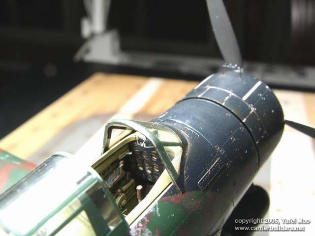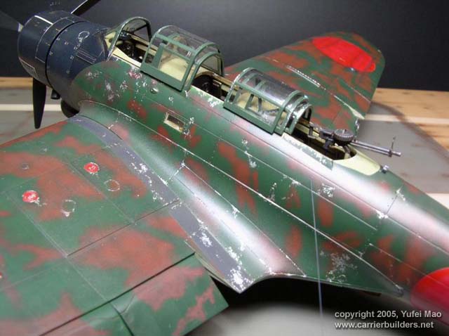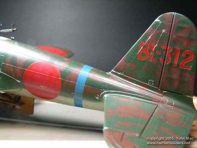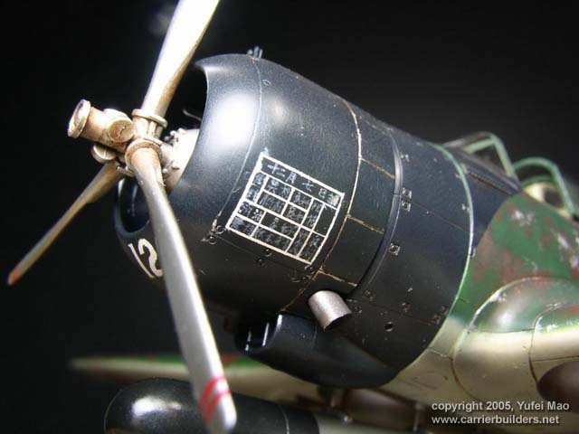 The kit from Hasegawa provides very good detail.As I'd like to make a Kate with torpedo used in Pearl Habor,the decals of the original kit,which provides a Kate used in the battle of Midway,is almost useless.So I decided to paint all of the markings appearing on the Kate by air brush and detail it with Eduard's PE set. The Kate I made belonged to aircraft carrier "Soryu",and the pilot was Juzo Mori,who attended many sea battles as a torpedo attacker pilot,including the attack on Pearl Harbor.During that attack,the torpedo of his Kate hit USS battleship "California" but the landing gear was damaged by AA guns and he lost the plane when he tried to make a landing on "Soryu".